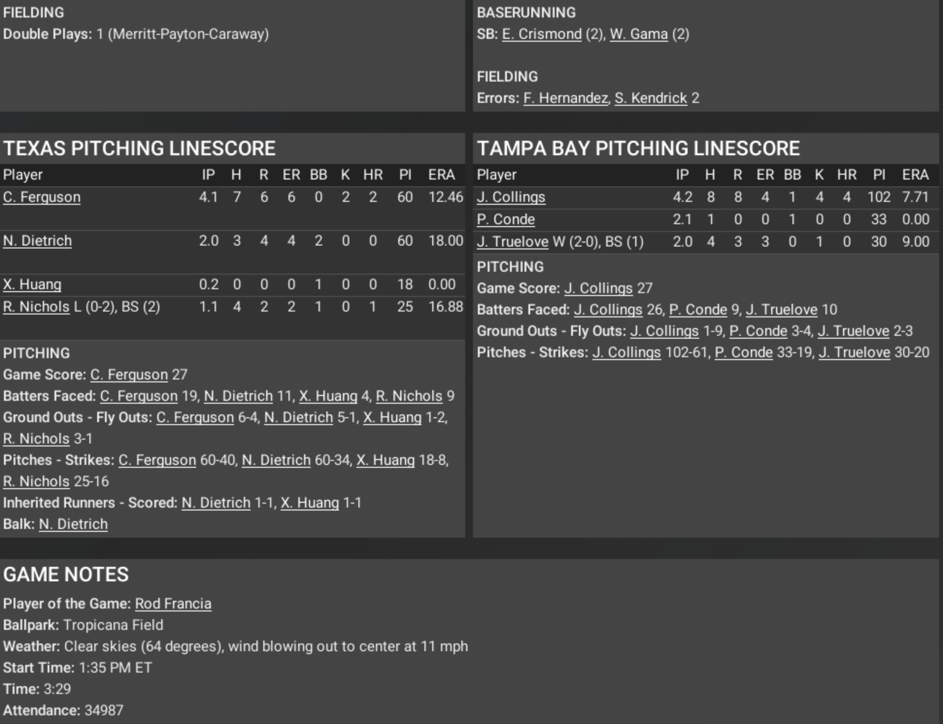Welcome back to Tropicana Field. If you like offense, drama, and a little bit of chaos, this one had all of it. The Tampa Bay Rays walk it off, 12–11, over the Texas Rangers to sweep the Wild Card Series and move on. Tim McCarver: Joe, this game felt like it changed personalities every inning. Texas kept landing punches, Tampa kept answering. And in the end, it came down to the man who defined the series — Rod Francia. Joe Buck: Let’s start at the finish. Bottom of the ninth, Rays down a run. Francia steps in against Ryan Nichols… and sends a solo home run into right. Tie game. Tropicana Field explodes. Tim McCarver: That’s a hitter who knows the moment. Francia wasn’t trying to do too much — he got a pitch he could handle and didn’t miss it. That was his third home run of the series, and it completely flipped the pressure. Joe Buck: And Tampa wasn’t done. Francisco Hernandez draws the walk, Johnny Nava drops down a perfect bunt, and suddenly Texas is scrambling. A fielder’s choice moves the tying run to third… Tim McCarver: …and then William Gama does exactly what you’re taught as a hitter — short, compact swing, line drive through the infield. Ballgame. Rays win it, 12–11. Joe Buck: Earlier, this looked like it might be Texas’ night. They scored four runs in the fifth, then rallied again in the eighth with three more to retake the lead, 11–10. Tim McCarver: But Joe, the Rangers never could put Tampa away. And when you let a lineup like this hang around — especially one that runs the bases well and puts the ball in play — you’re asking for trouble. Joe Buck: Francia finishes the game 3-for-5, three runs scored, three driven in, including the tying homer in the ninth. He’s your Wild Card Series MVP, hitting .500 with power and patience. Tim McCarver: And don’t overlook Tampa Bay’s resilience. They didn’t pitch particularly cleanly, they made a few mistakes defensively, but they stayed aggressive. They kept forcing Texas to make decisions — and Texas blinked. Joe Buck: So the Rays sweep the series and now move on to face the New York Yankees in the Division Series. That matchup coming up next. Tim McCarver: If this series is any indication, Joe, Tampa Bay is dangerous — because they don’t panic, and they don’t stop playing offense. Joe Buck: Final from St. Petersburg: Rays 12, Rangers 11. Tampa Bay survives, advances, and sends a message to the rest of the American League. |