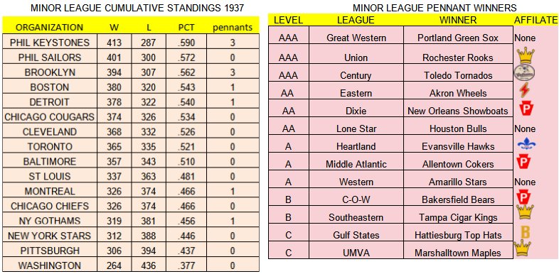 KEYSTONES ARE CLASS OF MINOR LEAGUES If minor league success breeds a winning major league organization then the future is very bright in Philadelphia as Keystones and Sailors are 1-2 in minor league success this season. The Keystones 5 minor league affiliates combined to post a .590 winning percentage and claim titles at 3 minor league levels. The cross-town Sailors, who always seem to have a successful minor league program, finished with the second best winning percentage but for a change failed to win a pennant at any of the five levels. The Sailors Class B affiliate in the Southeastern League came close but the Miami Sailors lost in a playoff tiebreaker to the Tampa Cigar Kings, a Brooklyn affiliate. The Miami entry has long been the class of the Southeastern loop with 8 pennants in the league's 12 year history including seven of the last nine years.Here is a look at the cumulative minor league standings for each of the 16 FABL organizations and a list of 1937 pennant winners. SCOUTING THE 1938 DRAFT CLASS PART FIVE: PITCHERS As has been the case in recent years there are several highly touted high school pitchers including one who has the makings of a future superstar. Of course predicting the future success of a 17 year old pitcher is risky business as injuries have derailed the careers of many promising arms but you have to think that Donnie Jones has the potential to become one of the best pitchers of his generation. OSA does not like pitching so odds are only 1 or two of these guys will make the list of 32 that go into the player lottery but expect a good portion of the remainder to be first round selections in the actual draft phase. JOHN DOBRZYNSKI 20 Eastern State University, Hometown Philadelphia, PA Dobrzynski tied for the AIAA lead in victories last season with his 9-5 record and his 3.27 era was among the best in the college ranks. He combined with teammate Jim Douglass to give Eastern State the best one-two punch in the AIAA last season and much the same should be expected from the duo this year. The righthander from Philadelphia is not pegged to be an ace by OSA, but the scouting services feels he can be a solid middle of the rotation arm.JIM DOUGLASS: 20 Eastern State University, Hometown Haddonfield, NJ Certainly not the same stature as Bobo White and Gus Goulding, who were teammates at St Blane College and went 1-2 in the 1934 draft but Douglass and Dobrzynski may be the most talented pair of college pitching teammates to enter the draft together since the Fighting Saints duo. Douglass was 8-2 with a 2.96 era last season, second lowest in the AIAA. At 15-5 for his college career he stands an outside chance of finishing in the top ten all-time in career AIAA victories. Ed Stevens, who pitched for Travis College from 1925-27 is currently tenth with 26 wins while the leader remains former Georgia Baptist ace Tom Barrell who won 34 games as a collegian. As for Douglass, OSA likes his chances of being a big league starter but feel his ceiling is the back end of the rotation.SAM GOULDING: 17 Springfield (KY) High School Not believed to be any relation to the previously mentioned Glen Goulding. Sam is actually pegged as a reliever by OSA and has come out of the bullpen in nearly half of his 41 high school appearances over the past three seasons. He is a groundball pitcher blessed with plenty of movement on his offerings, the best of which is a nifty curveball. Might be a high risk pick as OSA really does not see him as a starter but does believe he has the makeup to finish games. Perhaps best case is he becomes a Del Lyons type arm and that is not bad as while Lyons has struggled as a starter, he has been terrific coming out of the pen and made a pair of all-star game appearances with the Brooklyn Kings.DONNIE JONES: 17 Minneapolis (MN) High School The next great star perhaps? Donnie is the younger brother of Johnnie Jones, 1936 4th overall pick by the New York Stars, and by all indications will be an even better prospect than Johnnie was. He still has a year of high school eligibility left but has already claimed a list of accomplishments longer than his powerful right arm. Jones is a 2-time High School All-American and received consideration for the Adwell Award both times. He is one of only 4 high school pitchers to go 12-0 in a season. Jones set the single season high school strikeout record in 1936 with 215, no one else ever topped 200. He added 184 k's (8th highest all-time single season) last year and for his three seasons Jones is 4th right now with 525 career strikeouts with another year of eligibility remaining. It seems very likely he will surpass Al Duster's career high school mark of 637 strikeouts. Jones is 33-3 for his career and is also expected to set a new all-time wins mark for a HS pitcher (Al Duster also leads this category with 38). Jones had a 0.43 era in 1936, a standard only surpassed by Rufus Barrell II's 0.38 in 1935 and he will also likely finish among leaders in career HS era. His 0.97 ranks third presently behind only David Molina and Pete Papenfus. OSA might be understating their assessment of Jones saying simply he "has front of the rotation potential." His brother Johnnie earned the moniker "The Patron Saint of Groundballs." Donnie has a similar style and an equally flashy nickname as he is known simply as "Mole Killer." RAY KIRCHNER: 17 Franklin High School, Portland, OR Ray is the son of Raymond Kirchner, who was taken 4th overall out of High School in the 1912 draft but never made the majors. The elder Kirchner did play 15 seasons of pro ball, primarily with AAA Portland and won 165 minor league games. Ray was born in San Francisco while his dad was playing in the Philadelphia Sailors system but he grew up in the Pacific northwest and is another of the growing list of high school phenoms that have come out of Portland in the last few drafts. He has a 28-3 record to go with a 1.23 era over 3 seasons at Franklin High and looks like a potent