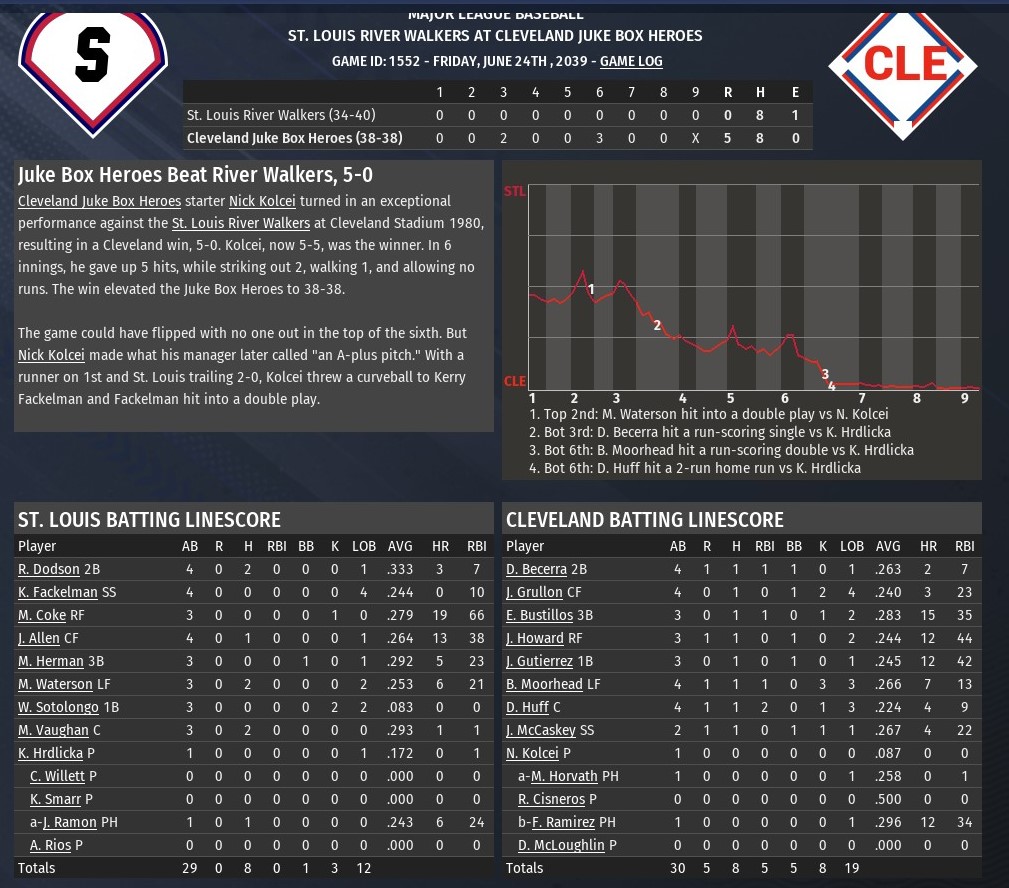 Nick Kolcei and a pair of relievers combined to shut out St. Louis on eight hits in Cleveland 5-0 win over the River Walkers at Cleveland Stadium (1980). Kolcei (5-5) handled the first six innings, allowing five hits (four singles and a double) while striking out two and walking one. The other three River Walkers hits came off Ricky Cisneros, who allowed three singles while holding St. Louis scoreless in the seventh and eighth. David McLoughlin set the Walkers down in order in the ninth. The Juke Box Heroes took the lead in the bottom of the third with a pair of runs off St. Louis starter Kevin Hrdlicka. John McCaskey led off the inning with a double. A Kolcei bunt moved McCaskey to third. Daniel Becerra scored him with a single. Jordan Grullon followed with another single, as Becerra moved to third. Edgar Bustillos hit a fly ball to center scoring Becerra. The Heroes other three runs came in sixth. Jon Howard led off the inning with a single off Hrdlicka. He scored on a Ben Moorehead double. Dan Huff did the rest with a two-run homer which sent Hrdlicka to the shower. |