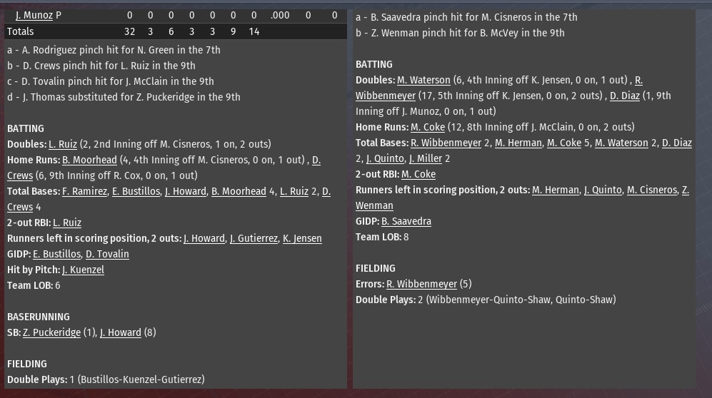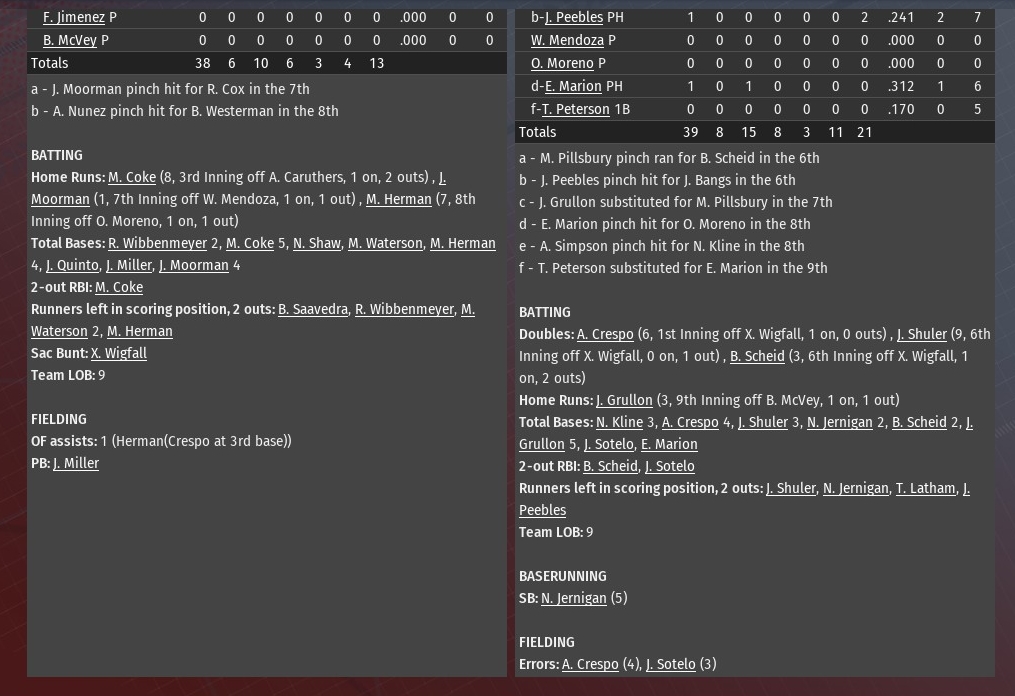 Keegan Jensen pitched five shutout innings and the Cleveland bullpen kept St. Louis from scoring until the bottom of the eighth as the Juke Box Heroes avoided a four-game sweep at Busch Stadium (2006). Jensen (3-4) allowed five hits (three singles, two doubles) during his time on the mound. He struck out two and walked none. Cleveland jumped in front in the top of the second inning against River Walkers starting pitcher Miguel Cisneros. Jon Howard led off the inning with a single and scored on a two-out double by Luis Ruiz. Ben Moorehead's homer off Cisneros in the fourth made it 2-0. The River Walkers got their lone run in the bottom of the eighth on a two-out homer by Miguel Coke off reliever Joe McClain. The Heroes got that run back in the top of the ninth, Dylan Crews with a solo shot off reliever Ron Cox. Nate Green pitched a scoreless sixth for the Heroes. McClain pitched two innings, allowing the lone run scored by the Walkers. Jose Munoz allowed two hits but no runs in the ninth for his eighth save. |