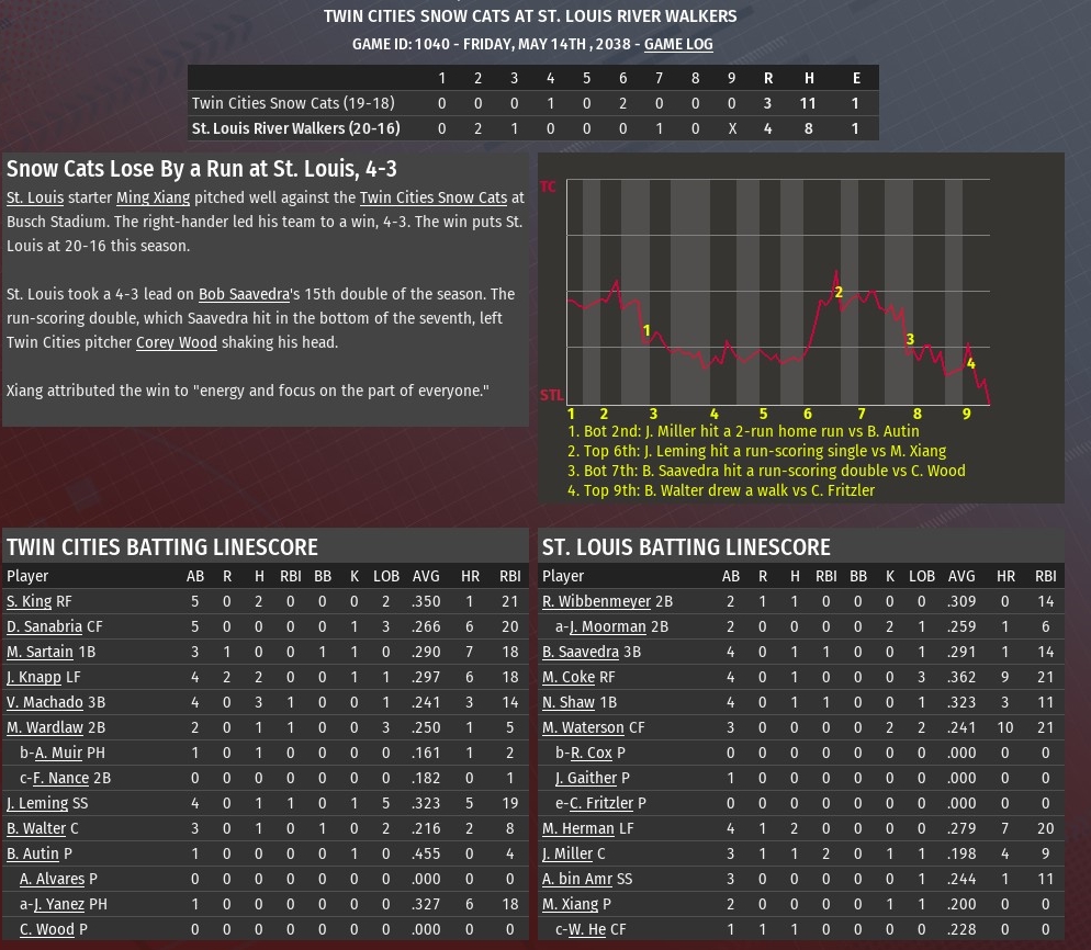 Rookie pinch-hitter Wen He doubled with one out in the bottom of the seventh off Twin Cities relief pitcher Corey Wood, he scored two batters later on a Bob Saavedra double to help give St. Louis a 4-3 win at Busch Stadium (2006). The Snow Cats had tied it 3-3 with a pair of runs in the top of the sixth inning against River Walkers starting pitcher Ming Xiang. Twin Cities put its first three batters on to begin the inning. Mike Sartain drew a lead-off walk and Jonathan Knapp and Victor Machado both singled to load the bases. Mike Wardlaw hit a deep fly ball to right to score Sartain. Jesse Leming followed with single, scoring Knapp, to tie it. Xiang got Bill Walter to hit into a double play to keep the score tied. Xiang pitched 6.1 innings, allowing three runs on eight hits. He struck out four and walked one. Ron Cox finished the seventh and got the first out of the eighth. Cox (3-0) would be awarded the win. Jesse Gaither got the final two outs of the eighth. Craig Fritzler converted his 10th save of the year in the ninth. Walkers second baseman Ryan Wibbenmeyer had to leave the game after he was injured while running the bases. No determination has been made on the extent of the injury. |