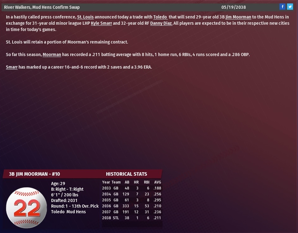 The Walkers acquired Moorman, 29, in the offseason expecting him to be their starting second baseman. But when free agent Ryan Wibbenmeyer went through the bulk of the off-season without being signed, St. Louis jumped at the chance to bring him into the fold. So far, it has paid off with Wibbenmeyer batting .325 with 17 RBIs through his first 37 games of the season. Wibbenmeyer's play has restricted Moorman's playing time, as he's only played in 19 games (seven starts) during which he's hit .211 with one homer and six RBIs. In Diaz, the Walkers hope to have gotten the backup corner outfielder they had in Eddie Estrella the past few seasons. Diaz, 32, has played in 23 games for the Mud Hens this season with two starts. He is hitting .296 with two homers and three RBIs. Smarr is a left-handed starter/reliever on a team in desperate need in help from the left-side of the bullpen. The 31-year-old has pitched in three games for Toledo, posting no record and a 7.36 ERA over 3.2 innings. At AAA Charlotte, he is 2-1 with a 2.16 ERA in four starts. Smarr will join the Walkers bullpen while the struggling Greg Sones returns to Memphis to try and get his game back in shape. Last edited by rink23; 03-26-2022 at 04:59 AM. |