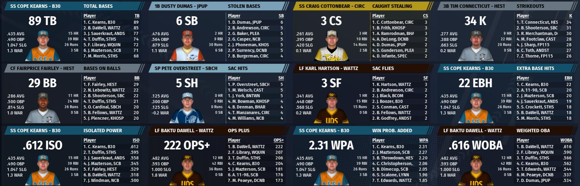 Small note: I simmed the May 1 games before I remembered to capture stats, so there are some deviations in statistical leaders from what should be represented.