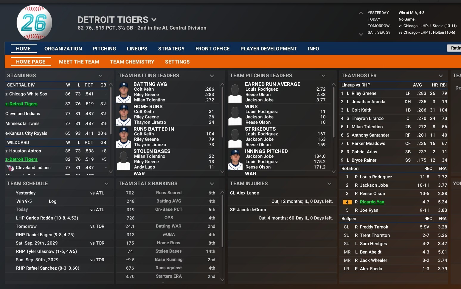 The Tigers (82-76) sit in second place in the Amercian League Central Division, 3.5 games behind the first-place Chicago White Sox with four games remaining in their regular season. It is the second straight postseason berth for Detroit, which won the division in 2028. The Tigers last reached the World Series in 2012, losing to the San Francisco Giants. Their last World Series title came in 1984, when they defeated the San Diego Padres. Last edited by rink23; 09-25-2025 at 03:39 AM. |