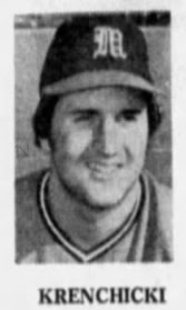 The first photo shows a head shot of Krenchicki in a University of Miami uniform. It's from the Miami News of January 8, 1976 and accompanies an article discussing his signing with the Orioles. The second photo shows him getting back to first base on a pickoff attempt. He is wearing a Miami Orioles uniform in the second photo. It's from the Palm Beach Post of May 21, 1976.