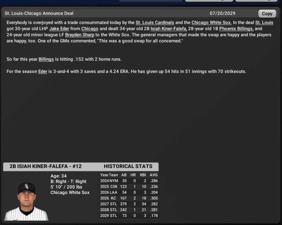 Eder, 30, has pitched in 38 games for Chicago this season going 3-4 with three saves and a 4.24 ERA. Making $990,000, he will be a free-agent at the end of the season. Billings, 28, has been given numerous opportunities to earn a lead role for the Cardinals over the past two seasons but has failed to take advantage. This season, he has played in 16 games/12 starts and hit just .152 with two home runs and five RBIs. Since 2026, he has played in 133 games/116 starts in the majors and hit just .202 with 20 homers and 57 RBIs. Acquired from Kansas City during the 2026 season, Kiner-Falefa has primarily been used an all-purpose infielder. But this season he started to squawk about not being a starter. This is despite him hitting .178 with no home runs and three RBIs in 28 games/20 starts. In his time with St. Louis, the 34-year-old has hit .271 with three home runs and 58 RBIs in 212 games/188 starts. A 20th-round pick in the 2027 draft, Sharp has spent the 2029 season at high-A Peoria and AA Springfield. The 24-year-old at Peoria at the time of the trade. In 75 games this season, Sharp has hit .281 with 12 home runs and 47 RBIs. |