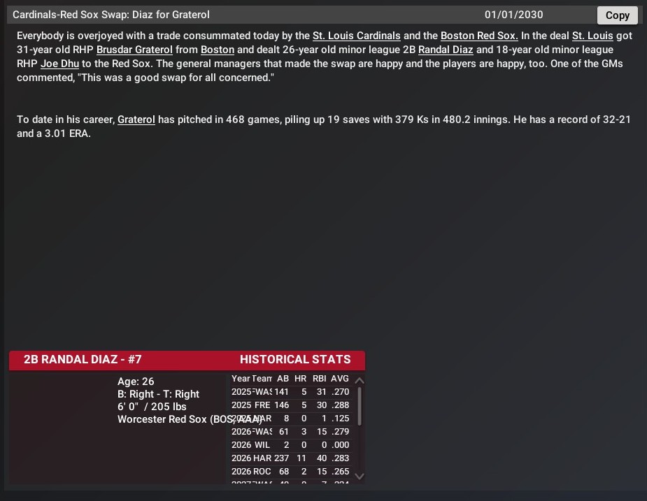 Graterol, 31, has been with the Red Sox since the 2026 season. Last year, he pitched in 52 games going 3-1 with a 3.79 ERA. Signed by Minnesota as an international free agent in 2014 Graterol broke into the majors in 2019 and since then has pitched for the Dodgers and the Red Sox. In 468 games, five starts, he has a career record of 32-21 with 19 saves and a 3.01 ERA. Acquired via trade from the Nationals, who had drafted him in the fifth round of the 2024 draft, Diaz, 26, split the 2029 season between AA Springfield and AAA Memphis. In 114 games/101 starts, he hit .238 with 14 home runs and 53 RBIs. Signed out of Australia in March of 2028, the 18-year-old Dhu split 2029 between the Rookie League team in Florida and Class A Palm Beach. In 18 games/seven starts, he was 2-4 with a 5.47 ERA. |