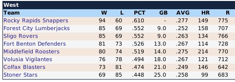 Monday, September 17, 2018 2018 Ruthlandian West Final Recap RR Snappers Roll To 2nd Straight RU West Crown For the second successive season the Rocky Rapids Snappers have captured the Ruthlandian West pennant by a fairly-wide margin... the Snappers easily won the title by 9 games over Forest City and Sligo... fourth place went to Fort Benton, who were 14 games back... resurgent Middlefield claimed fifth with its best season in years... the Roosters were 14 games behind... Volusia experienced its worst season in its history - sixth place and 18 games off the pace... it was another tough year for Colfax, which came in seventh, trailing by 21... and Stoner dropped back into its also-ran past with a last-place finish, 25 games behind winning Rocky Rapids. Rocky Rapids won 94 games under manager Ryan Noland and is headed for a showdown with the defending IPA champion Eastshore Elegants in the RU Elite 8 Series... the Snappers were swept last season in the first round and are itching to redeem themselves... and they may just do it... Noland has a splendid ball club with outstanding hitting (1st) and pitching (3rd), near the top in both categories... Rocky Rapids ranks 4th in scoring and 8th in homers... Noland has three superb starters... the ace is his son, Junior Noland (23-10 2.57), along with Joe Anderson (21-13 2.62) and Don Chaney (18-15 3.12)... Milt Baker (4-3) stood out in the bullpen with 35 saves and a 2.22 ERA... Baker tied for the most saves in the IPA... at the plate the Snappers have good punch with fine 3B Paul Shelton (.277/37/139/99), legendary C Hank Bethel (.323/15/92/75), LF Rob Barton (.322/13/69/104) and 14-year veteran CF Carl Johnson (.291/24/72/96)... it's doubtful Eastshore will sweep the Snappers this year... many scribes say Noland has the best all-around team in the IPA. The Sligo Rovers and Forest City Lumberjacks moved up in the standings this season on the strength of better pitching... the Rovers moved up from 5th to a tie for 2nd, while the Lumberjacks climbed from 7th to 2nd... Sligo was led on the hill by Les Patterson (21-12 2.32) and Ralph Odakota (15-8 3.29)... offensively it was 3B Manny Alou (.291/38/125/105) and SS Vic Carlin (.261/31/113/100) leading the way. Rob Jackson at Forest City had three quality arms... Tommy Zenon (22-7 2.64) sparked the team with a great season and had help from starters Ricky Hoffman (17-14 3.43) and Paul Crews (12-7 3.82), along with a solid closer in Andy Velasco (5-4), who compiled an astronomically-low 0.87 ERA and posted 34 saves... the Lumberjacks only offensive force was 14-year star LF Joe Judlin with 41 homers, 94 RBIs, 105 runs scored and a .315 batting average. Smitty Michaels got massive improvement in his Middlefield Roosters as they rose up from the cellar to fifth place... good pitching did wonders for the Roosters... Joe Schneider (22-8 2.19) had an outstanding sophomore year and led the RU in ERA, which is remarkable considering how small Middlefield Park is... Frank Dean also contributed a 19-15 record with a solid 3.52 ERA in a hitter's paradise... Middlefield didn't do it all with pitching, it still is blessed with some fine batsmen like RF Vic Ivarsson (.332/33/104/1-2), CF Chuck Larkin (.304/49/113/104), 3B Stu Butterworth (.285/39/94/80) and SS Jim Rose (.286/29/71/117)... a better foursome would be hard to find in the IPA... The Roosters led the RU with 214 homers... Larkin tied Jack Elliott of High Mesa for the home-run lead in the IPA this season... they each belted 49 out of the park. It was a tough year for manager Alfonso Feliz, who saw his proud Volusia Vigilantes endure the worst season in its history... the V's fell to sixth place, the lowest the team has ever been... Volusia no longer has standout pitching... Sixto Moreno (15-10 3.69) and vet Gerry Hersh (16-17 3.30) are Feliz's best moundsmen... Volusia's terrific young CF Joe DeLucca (.338/30/114/103) continued to assault RU pitchers... fine C Ismael Gomez chipped in with a .316 BA, 27 roundtrippers, 77 RBIs and scored 100 times in his second year in the league. Clem Rogers at Colfax has seen his once-unrivaled staff fall into disrepute... consequently the Blasters have wound up near the bottom for the second straight year, dropping from 6th to 7th this season... However, Colfax still had a pair of solid hurlers.. 16-year vet and all-time IPA great Ilya Szabo was 17-13 with an impressive 2.53 ERA at age 39... Szabo is 285-160 in his career... young Cliff James is still a fine pitcher despite his 14-17 mark this year... James posted a solid 3.19 ERA... he just needs better run support... Colfax rank near the bottom in scoring with a .249 BA... top hitters are 26-year-old LF Billy Garrett, who blossomed with 32 homers and 89 RBIs after being traded from Kilkenny, and vet C Joe Alexander with 29 home runs and 88 RBIs. Benny Stern didn't do well as he did with a fourth-place finish in 2017... his Stoner Stars plunged into the cellar this year... the Stars are not much offensively, but do possess some quality hurlers... Stern's best are Billy Chapel (18-15 3.74), Don Patterson (15-18 3.61) and Charley Norton (17-20 2.55)... Norton was a workhorse the entire season and suffered greatly from a lack of runs... LF Mike Jaffe (.306/28/105/96) is a fine young hitter, who put up good numbers for the sixth year in a row... the 24-year-old Jaffe is a lifetime .326 hitter... 19-year-old C Rob Stern, following in the footsteps of his father, batted .336 in his second season with 7 homers, 47 RBIs and scored 79 runs... good things are expected from the younger Stern in the coming seasons. |