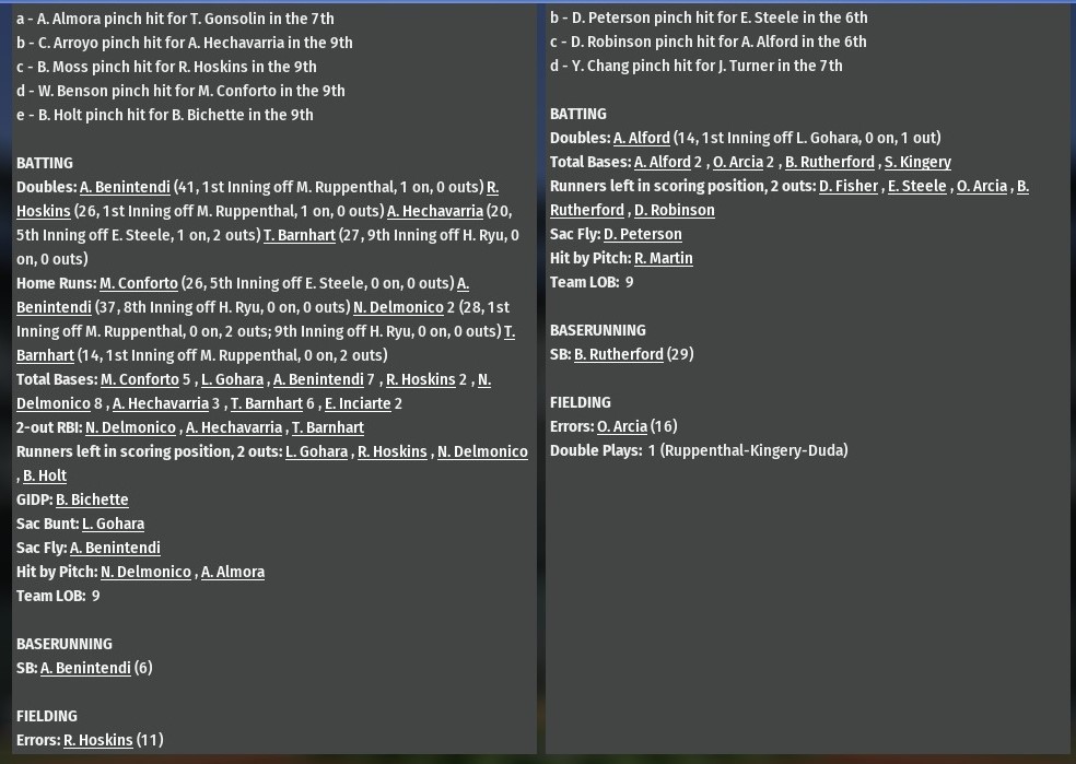 Twin Cities scored four runs in the top of the fifth inning to take the lead and held on for a 6-5 win over St. Louis at Busch Stadium (1997). Tied 1-1, the Snow Cats put their first three batters aboard against River Walkers starting pitcher Kyle Hendricks to open the fifth. With relief pitcher Chris Ellis at the plate, catcher Manny Pina then allowed a pitch to against passed him allowing the go-ahead run to score. Ellis followed with a three-run homer, a 399-foot shot over the left-field fence, as all of a sudden Twin Cities was ahead 5-1. The Walkers responded with three runs in the bottom of the fifth against Ellis. Will Benson plated the first two with a pinch-hit double. The Cats added an insurance run against Reyes Moronta in the seventh. Patrick Mazeika led off with a double and scored on a sacrifice fly from Colin Moran. St. Louis cut the deficit back to 6-5 in the bottom of the seventh. Pina led off with a single and scored on a two-out single from Ender Inciarte. Despite getting their chances, they left five runners on base over the final three innings, the River Walkers would not score again. Chris Stratton lasted just 3.2 innings while making the start for the Cats, he allowed just one run on two hits. Five relievers -- Chris Ellis (1.1 IP), Randy Rosario (1.1), Carlos Alejandro Ramirez (0.2), Anyelo Gomez (1.0) and Thyago Vieira (1.0) -- followed Stratton to the mound, with Ellis earning his first win and Viera save No. 17. Last edited by rink23; 03-21-2019 at 03:04 AM. |