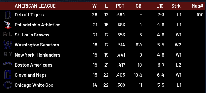 Are hitting .289 as a team (3rd), have the best FIP in the AL (3.18). Are sitting next-to-last in the AL with a 15-22 record. So what gives? Well they say good pitching usually beats good hitting. But nowhere in that equation does fielding rate a mention. The 1903 White Sox show that you can have great hitting and great pitching, but if your defence can't do its job then you may as well have neither. Despite their great FIP the Sox have given up more runs (182) than their potent lineup has scored (173), thanks mainly to 85 errors and the second-worst ZR in the league. They'll need to tighten this up if they don't want to waste what should have been a successful season. |