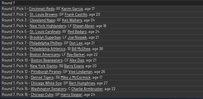 Only 7 rounds in this year’s Rookie Draft, so spots in the FL were keenly fought for. Boom catcher Patsy Gharrity went first overall, with the Reds picking him up, and once again position players dominated the early rounds. The first pitcher to be taken was Bob Wicker, at 12 by the Pirates.