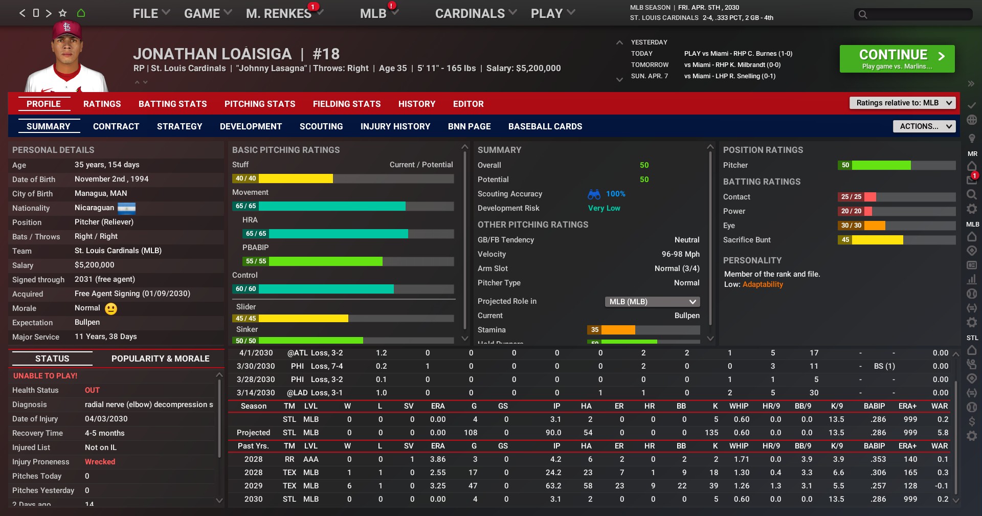 The St. Louis Cardinals have learned that right-handed relief pitcher Jonathan Loaisiga will miss up to five months after he suffered an elbow injury (radial nerve decompression) while pitching in a 3-2 loss to the Atlanta Braves on April 1.