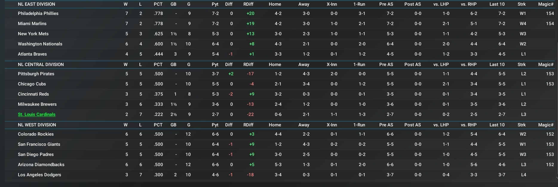 Record: 2-7, 5th, 2.5 GB Pittsburgh and Chicago Cubs