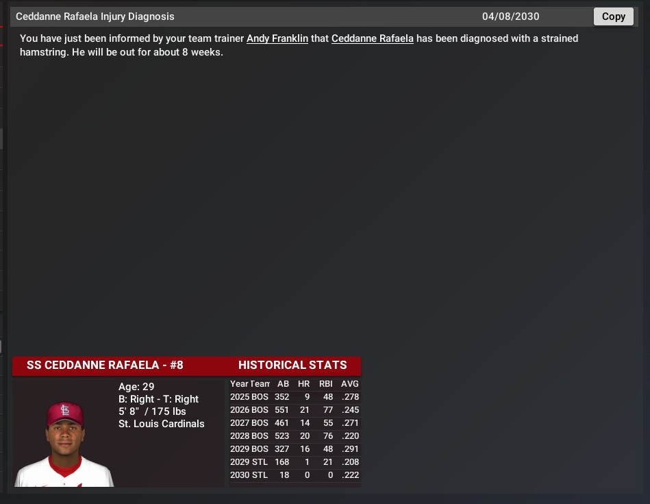 The St. Louis Cardinals have placed IF/OF Ceddanne Rafaela on the 10-day injured list after he suffered a strained hamstring during a 4-3 win at Atlanta on April 3.