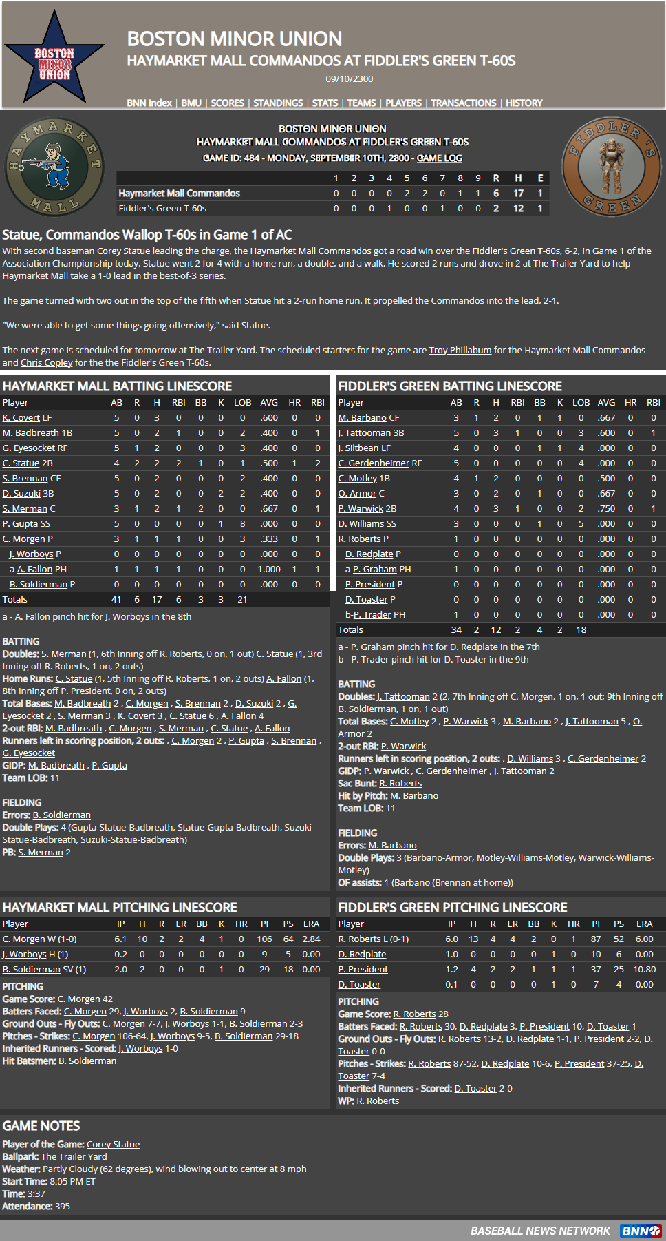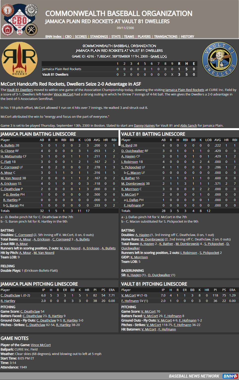 Game 3 - Goodneighbor 2 at Diamond City 1, 11 inn. Game 4 - Goodneighbor 0 at Diamond City 3