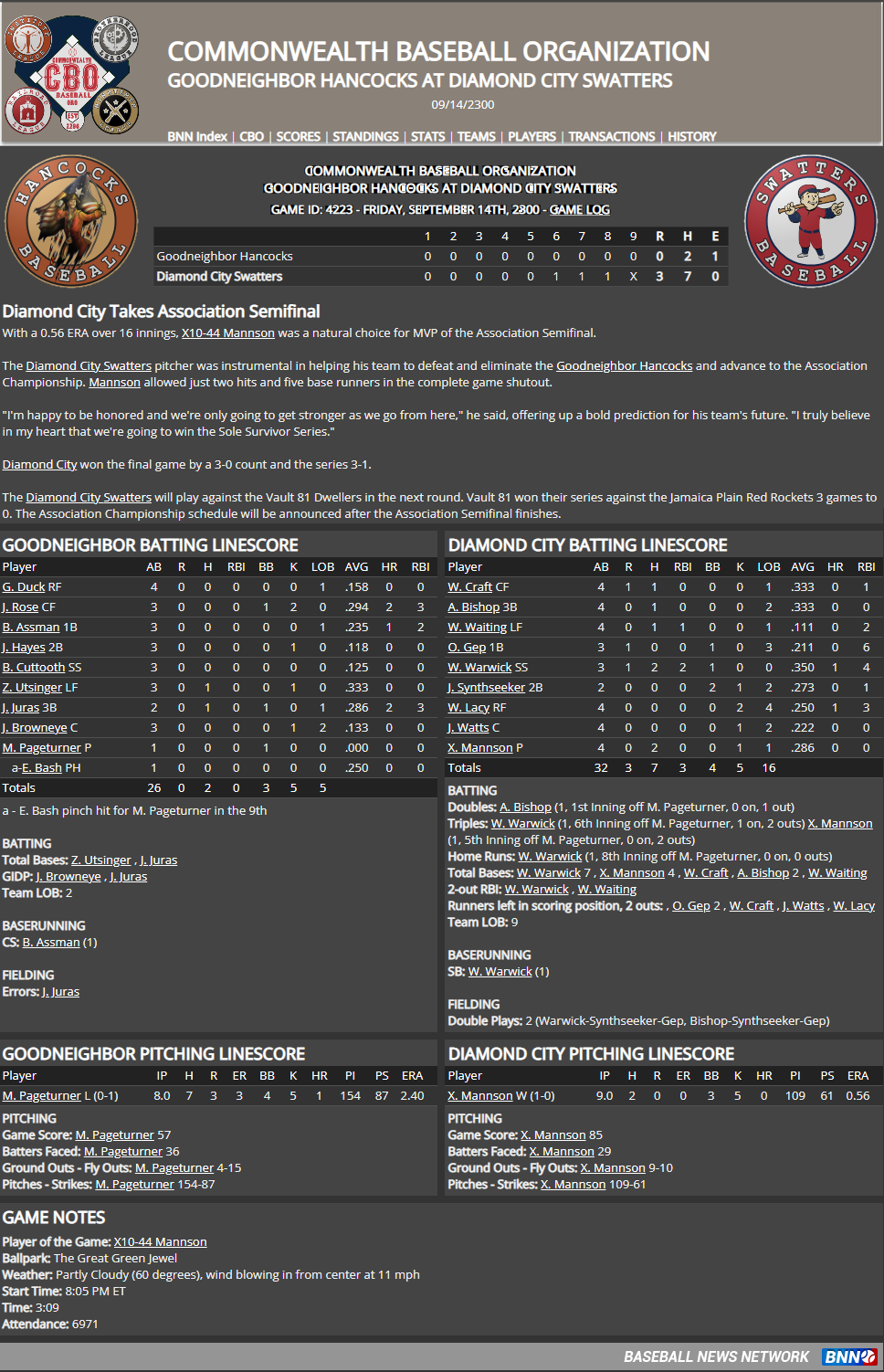 Season Series: Diamond City 6, Goodneighbor 2 Apr 5-6 @DC: Good 10-3, DC 6-5 Apr 24-25 @Good: DC 6-1, DC 13-9 July 10-11 @Good: DC 4-0, DC 4-2 Aug 28-29 @DC: DC 6-0, Good 4-2 Goodneighbor Home Page Diamond City Home Page Game 1 Matchup Analysis This is quickly becoming a playoff rivalry with the past two Sole Survivor Series Champions knocking each other out in the playoffs. Two seasons ago, it was Goodneighbor getting the best of the Swatters, 3 games to 2, on their way to the championship. Last season, the teams met in the SCA Final where Diamond City claimed the series, 4 games to 2, on their way to raising the championship banner. This season, the Hancocks recovered enough to earn their fourth straight Minutemen League title. The Swatters did not follow up their championship season with a repeat Railroad League title, but they are still a serious contender for another Sole Survivor Series title. Especially, Diamond City dominated the season series against the Hancocks, including winning all four in Goodneighbor. For Goodneighbor, they are again a formidable team all around. Finishing 2nd in the SCA in run scored (592) and 4th in runs against (489), Manager Jeremy Whitelplate again has his team in position to play deep into the playoffs. The hears of the team is still 1B Bryan Assman (.352/22/69) who had a "down" year after his back-to-back MVP seasons. He has a bevy of support around him, including 2B Jumper Hayes (.326/20/82), SS Burtie Cuttooth (.279/21/83), and RF Good Don Duck (.330/13/71). Pitching is led by ace Matt Pageturner (15-5, 3.27), along with two other good pitchers in Quincy Eloquent (13-10, 3.85) and Josh Dude (10-4, 3.69). CL Tiny Green (26 SV, 2.23) is among the best as a closer, and Justin Wilkerson (3-0, 3.33) earned quality innings throughout the season. The Swatters are hoping to find playoff magic again. First, they will need to find more success from their offense, which finished 8th in scoring offense (532 runs). They do dominate on the mound, though, finishing best in runs allowed (449), 3rd in Starters ERA (4.06), and 2nd in Bullpen ERA (3.57). On offense, 1B Oren Gep (.333/37/87) has become a star. He is supported by another star in SS Wally Warwick (.335/26/81) and LF Waze Waiting (.293/21/40). RF Wayne Lacy (.281/11/47) has seen his home run production drop drastically from an SCA-best 37 two years ago. Diamond City also has an incredible 1-2 punch on the mound in X10-44 Mannson (15-5, 2.74) and Tyler Powers (15-4, 3.09). There is a debate of who should be the 3rd starter, Tim Fusion (8-16, 4.82) or City Moore (16-9, 3.88), though MGR Bucky Bachelor seems to favor the Vim! Pitcher Award winner from two years ago in Fusion. The closer Josh Samm (28 SV, 3.17) is unquestionably one of the best, and Mike Pond (3-0, 1.38) is an inning eater. Prediction This one is our top series for the elite eight of the CBO playoffs. Based on their ability to shut down the Goodneighbor offense, we have Diamond City winning this one in a thriller, 3 games to 2.
