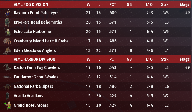 BNN Weekly Report This Week in the CBO, BMU, and GBRL by Nat Wright-Kawolski 20 May 2301 Players of the Week North Charles Association Picks Top Player: Zeldolph Violet demonstrated his potential to be a star in the game last week and today he took home the North Charles Association Player of the Week Award. The Starlight first baseman wreaked havoc on opposing pitchers last week, pounding them for a .435 average (10-for-23) with 2 home runs and 9 RBIs on his way to claiming the honor. So far this season Violet has hit .298 with 8 home runs, 32 RBIs and scored 23 times. Laughy Collects Player of the Week Award: It's always a thrill for fans of the team and students of the game alike when a superstar in the making shows what he's got. Ricky Ticky Laughy, the Oberland T-51s 23-year-old center fielder, put himself in the spotlight last week making him the clear-cut choice for South Charles Association Player of the Week honors. He ripped 8 hits in 18 at-bats, compiling a .444 average with 3 home runs and 6 RBIs. So far this season Laughy has put up a .284 batting average with 38 hits, 11 home runs and 33 RBIs. Transactions Monday, May 20th , 2301 Sunshine Tidings Chemists: Placed CF Fernando Z on the 7-day injured list, retroactive to 05/19/2301. The Slog Ghouls: Activated RF Boots Yellowhair from the injured list. FHE Yao Guai: Signed RP Austin Peterson. The Salem Witch Hats traded 22-year old minor league RHP Ichavod Shoemaker to the Sunshine Tidings Chemists, getting 30-year old minor league 1B Eddie Can in return. Sunday, May 19th , 2301 Abernathy Adamantium: Placed SP Gerald Jerry on the 7-day injured list, retroactive to 05/18/2301. Saturday, May 18th , 2301 FHE Yao Guai: Placed RP W. H. Lub on the 7-day injured list, retroactive to 05/17/2301. The Slog Ghouls: Placed 2B C.T. Woodard on the 7-day injured list, retroactive to 05/17/2301. Fort Hagen Silver Shroud: Activated SS Well Done Dungan from the injured list. Fort Hagen Silver Shroud: Sent SS Well Done Dungan to Triple A C.I.T. Ruins for injury rehab. Fort Hagen Silver Shroud: Activated RP Matt Demented from the injured list. Fort Hagen Silver Shroud: Released 3B Twin Fratelli. FHE Yao Guai: Signed RP Josh Maney. The Slog Ghouls: Signed C Keith Biography. Friday, May 17th , 2301 Nordhagen Beach Party Boys: Activated SP Chet Arthur from the injured list. Nordhagen Beach Party Boys: Sent SP Chet Arthur to Triple A Greentop Nursery for injury rehab. Thursday, May 16th , 2301 Abernathy Adamantium: RP Danny Rocketman returns from his rehab assignment. Finch Farm Four Leafs: Activated RP Zippy Patterson from the injured list. The Nordhagen Beach Party Boys traded 18-year old minor league C Bryan Coltfourty and 23-year old minor league RHP Adoptee Packwood to the Cranberry Island Hermit Crabs, getting 32-year old RHP Bill Hench in return. Wednesday, May 15th , 2301 Sunshine Tidings Chemists: RP Josh Kelley returns from his rehab assignment. Sunshine Tidings Chemists: Released 1B Chris Wager. Easy Town Assaultrons: Released C Keith Biography. Oberland T-51s: Released RP Josh Maney. Easy Town Assaultrons: Signed RP Nick Dyson. Standings Team Power Rankings Weekly Team Power Rankings: Here are the current team power rankings for Commonwealth Baseball Organization: Teams (Total Points, Tendency): 1) University Point Deathclaws (133.6, +) 2) Salem Witch Hats (128.3, +) 3) Diamond City Swatters (126.4, -) 4) Nordhagen Beach Party Boys (119.3, -) 5) Abernathy Adamantium (119.1, o) 6) Concord Radstags (114.1, o) 7) Vault 81 Dwellers (109.0, +) 8) Atom Cats (101.9, -) 9) Easy Town Assaultrons (98.7, ++) 10) Fort Hagen Silver Shroud (97.6, -) 11) Jamaica Plain Red Rockets (92.4, ++) 12) Starlight Lady Killers (90.4, -) 13) Goodneighbor Hancocks (88.4, --) 14) FHE Yao Guai (86.4, -) 15) Quincy Gunners (83.3, ++) 16) Roxbury Rad Sox (83.3, --) 17) Oberland T-51s (79.3, -) 18) County Crossing Bloodbugs (78.1, +) 19) Sunshine Tidings Chemists (67.0, +) 20) The Slog Ghouls (67.0, --) 21) Egret Ninjas (56.7, +) 22) Finch Farm Four Leafs (53.7, -) 23) Lexington Synths (46.6, o) 24) Warwick Mirelurks (39.3, o) Analysis Playoff Picture Through 30 Games NCA: 1. Salem (league record tiebreaker over Nordhagen Beach) 2. Abernathy (league record tiebreaker over Concord) 3. Nordhagen Beach 4. Concord 5. Easy Town SCA: 1. University Point 2. Diamond City 3. Vault 81 4. Atom 5. Jamaica Plain (best head-to-head record among FHE and Goodneighbor) 6. FHE (second-best head-to-head record among Jamaica Plain and Goodneighbor) 7. Goodneighbor (third-best head-to-head record among Jamiaca Plain and FHE) Minor League Report BMU Players of the Week CA Player of the Week Awarded: Harry Bush has the tools to stick in this league for many years. The 24-year-old first baseman of the Mystic Pines Raybathers had a hot bat in the Commonwealth Association over the past seven days and won the Player of the Week honors. Bush batted .455 with 5 hits in 11 at-bats, 3 home runs and 6 RBIs. So far this year, Bush is batting .333 with 4 home runs and 16 RBIs. MA's Top Player, Motley of Fiddler's Green: Chris Motley is respected by most Fiddler's Green T-60s fans for his no-frills style of play. The 25-year-old first baseman went about his business with vigor last week to grab the Massachusetts Association Player of the Week honors. He compiled a .692 average (9-for-13) with 3 home runs, 9 RBIs and 7 runs scored. So far this year in 6 games Motley is hitting .500 with 3 home runs, 9 RBIs and 8 runs scored. Standings GBRL Players of the Week Robotics Experts Noob Named NL's #1 Player: One of the league's most exciting young players, Sam Noob of the Galleria Robotics Experts earned himself North League Player of the Week honors with a standout performance in last week's games. For the week the 21-year-old right fielder had a lofty .438 average (7-for-16), collecting 3 home runs, 5 RBIs and 5 runs scored. Presently Noob is hitting .386 with 7 home runs and 14 RBIs. He has played in 11 games