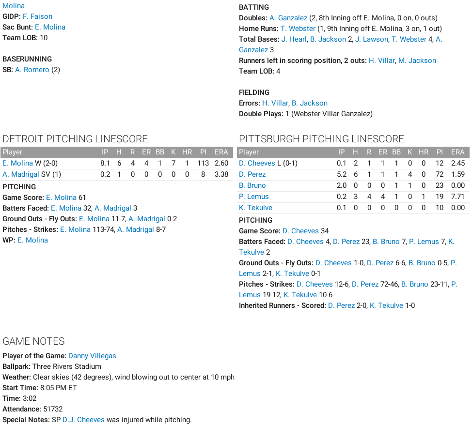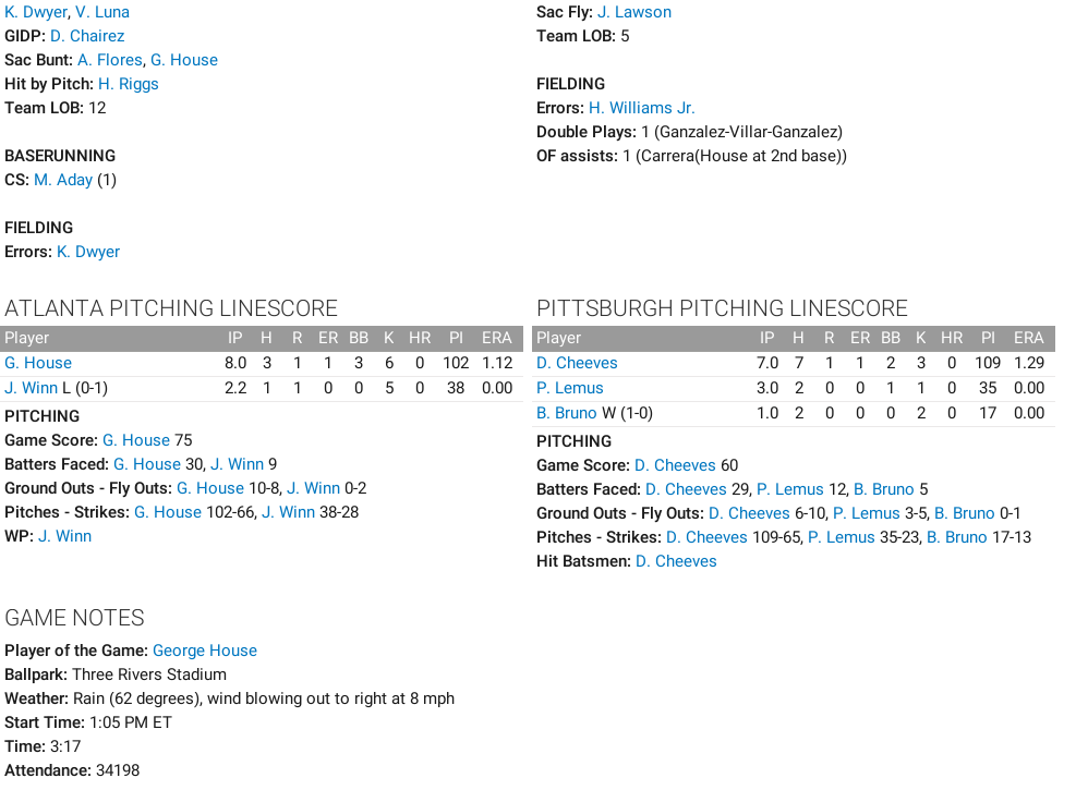 News -------------------- October 7: It's rainy but a pretty decent 62 degrees at Three Rivers today. 34,198 fans are in attendance tonight. What is up with attendance this year? I guess the fans want to eat hot chip and play Fortnite. The Braves choose to go with George House (14-10, 3.16), who wasn't quite the ace this year but has that on his resume. He was 1-1 vs Pitt in 1972. House pitched around 60 fewer innings than he did in 1971 because of a torn hamstring that kept him out for more than a month but when he did pitch he was as effective as ever. He did finish 10th in both fewest walks per 9 (2.3) and most Ks per 9 (6.1). The Bucs go with the obvious choice for Game 1, DJ Cheeves (22-9, 2.48), the craft vet who finished 2nd in the NL in wins, 5th in ERA, 8th in strikeouts (184), and 4th in innings pitched (290). Oh, and 1st in winning percentage (.710). He's as good a candidate as any for the Cy Young Award. Top 1st: Chris Ward fouls out to third. Clinton slaps a base hit into center. Dwyer lines out to shortstop. Riggs flies to left. 0-0. Bottom 1st: Hearl grounds out to short. Villar knocks a liner down the right field line and is in at 2nd base before Henry Riggs can make a throw. Webster hits one to the opposite field, which for him is left, for a base hit. Villar stops at 3rd but we've got runners on the corners with 1 out and cleanup man Justin Lawson at the plate. Lawson hit .270 with 8 HRs in 159 scoring-position at-bats. He flies out to center but it's deep enough to score Villar from 3rd base. 1-0, Pirates! George House catches Arturo Ganzalez looking to retire the side. 1-0, Pittsburgh. Top 2nd: Chairez hits a high fly to right center that Lawson gets under for out number 1. Vicente Luna grounds out to third. Aday, hitting a bit lower in the order than where he's accustomed, walks in a 3-2 curve by DJ Cheeves. He's erased on a caught stealing on the very next pitch. 1-0, Pittsburgh. Bottom 2nd: Carrera hits one of those deep flies to center that get behind bad fielders but Michael Lee Aday's got the range to catch up to it. Out number 1. Hank Williams Jr. fouls out to the first baseman. Doug Connally hits a weak grounder to short. 1-0, Pittsburgh. Top 3rd: Cheeves strikes out his first man of the game, Armando Flores, on a 1-2 change. George House, not the best hitter even for a pitcher (he hit .095 this year) gets a rare single to right but misjudges it and runs into an out at 2nd. Credit Carlos Carrera with the baserunner kill. Chris Ward hits a pop foul that 3B Hank Williams Jr. catches up to in time to end the inning. 1-0, Pirates. Bottom 3rd: Cheeves hits a textbook grounder to short, 6-3, one out. Justin Hearl hits a grounder right at 1B Dante Chairez, who takes it to the bag himself for out #2. Villar is robbed of hit number 2 as Bill Clinton makes a diving stop before the ball could get into center. 1-0, Pirates. Top 4th: Clinton follows up the web gem with... a routine grounder to 2nd. Kevin Dwyer shows off his batting-champion skills, going with a 1-1 fastball that nips the outside corner for a single into right field. DJ Cheeves misses on a 3-1 pitch to Riggs and we've got runners on 1st and 2nd with 1 out. Dante Chairez slaps a grounder towards short; Henry Villar is up with it in time to get Riggs at 2nd but that's all as he breaks up the double play. Runners on the corners now, 2 out. Vicente Luna also hits one to Villar, which is not the wisest of decisions; the 6-3 groundout ends the inning. 1-0, Pirates. Bottom 4th: House strikes out Tyler Webster swinging; that's his 2nd K so far. He proceeds to get Justin Lawson swinging on a 2-2 cut fastball. Ganzales hits the first pitch he sees, a soft liner that seems headed to right-center, but 2B Kevin Dwyer leaps up and makes the catch for the final out of the inning. 1-0, Pirates. Top 5th: Michael Aday hits a screamer up the middle. Henry Villar is just able to grab onto it but can't make a play. Aday's on with a leadoff base hit. Armando Flores hits a soft fly into right field for out #1. George House lays down a good bunt that gets Meatloaf over to 2nd base. Chris Ward bangs a single back up the middle; the speedy Aday scores from 1st and we're all tied up! 1-1. Clinton hits a hard grounder to 2nd that ties up Tyler Webster; score that another base hit, the 2nd infield single of the inning. Dwyer strikes out on a 2-2 pitch, though, as DJ Cheeves wiggles out of this one. 1-1. Bottom 5th: Carrera flies out harmlessly to center field. Hank Williams Jr. draws a walk. The 23 year old son of the famous country singer loves to walk as much as he loves to ride - I mean, I assume he loves to ride. He had 42 walks against 164 major-league at-bats this year for an OBP of .401. Doug Connally hits a hot shot right at Vicente Luna at third that looks an awful lot like a 5-4-3 double play but Williams breaks it up in time. DJ Cheeves grounds out to short to end the inning but hey, they reset the lineup. Yes, when you speak of the Pirates, you must use deadball era terminology. 1-1. Top 6th: DJ Cheeves doesn't have his greatest stuff tonight and it shows here, as he hits RF Henry Riggs to lead off the inning. Riggs was not hit by a pitch at all during the regular season. Dante Chairez puts decent wood on his ball but gets under it and flies to right field. Luna also hits a fly to right, though his is a lot weaker. Michael Lee Aday's gotten on twice with a walk and a base hit, but this time around he's the victim of a swinging strikeout. 1-1. Bottom 6th: Justin Hearl works George House to a 3-2 count and then takes a cutter that is around six inches outside for ball four. That's House's 2nd walk. He's mostly stayed ahead of the count and is sitting on just 65 pitches so far. Henry Villar lays down a sacrifice hit that does the trick, moving Hearl into scoring position at the cost of the first out of the inning. Tyler Webster strikes out in a very clutch situation. Justin Lawson just does manage to make contact with a 2-2 cu