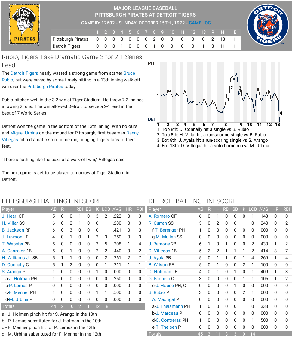 -------------------- October 14: The TV show "Kung Fu", starring David Carradine, debuts on ABC. It will run for 3 seasons and really shake my confidence in the notion that the Brewers' 2B James Hong is a teenager (he plays a very much not-teenager in one of the episodes of this show). October 14: "Last Tango In Paris", starring Marlon Brando and Maria Schneider and one of the few forays into adults-only, non-porno film, premiers at the New York Film Festival. It carries the "X" rating but will still go on to be the 7th highest grossing film of 1973. October 14: This happened a couple days ago but what the heck, it's an off day so... the Denver Bears (Texas) won the Minor League World Series, beating the Toledo Mud Hens (Detroit) in 6 games. 23 year old SS Dusty Hill, who rose through Pittsfield (.280, 3, 37) to put together a scorching final 11 games of the season with the Bears (.447, 1, 9) and followed that up with an 11-21 run in the playoffs to win MiLB WSMVP. And all that with a massive beard (IRL he's the bass player for a little band known as ZZ Top). Don't be surprised if he's in the big leagues next year. October 14: While I'm at it here... the Phoenix Giants (SF) beat the Eugene Emeralds (Philadelphia) to win the PCL Championship. Heartthrob/closer Don Johnson, another guy who spent most of the year in AA, won the PCLCS MVP with 7 innings of relief ball over 4 games including 2 saves and the clincher in Game 5. October 15: A cow is killed by a meteorite in Trujillo, Venezuela. To date this is the only verified instance of an animal dying in this manner. Slow news day? October 15: Jackie Robinson IRL makes his last public appearance, throwing out the first pitch in Game 2 (no Jackie Robinson in my save, sadly; then again, there isn't a color barrier either). He'll die of a heart attack 9 days alter. October 15: An-An, the famed giant panda at the Moscow Zoo, dies at 15. October 15: It looks like the Pirates will elect to keep their rotation secure and will use Santos Arango in Game 3 instead of DJ Cheeves even though the latter is reportedly ready to go. No point in blowing him up. He's facing Bruce Rubio, who himself is pretty well rested after getting pulled after only 79 pitches in Game 3 of the ALCS. Clear skies and... 47 degrees. Tigers fans, hope you brought your coats! Arango is a lefty but after the Friday the 13th drubbing I figured it's bad luck to use the right-handed Berenget in left again; I'll go with Danny Hohman again. Top 1st: Hearl flies to right. Villar flies to left. A flyball pitcher in Tigers stadium is not a great matchup but we've had this issue with Bruce Rubio all year (and last year) so it's nothing new. Jackson goes down 4-3. 0-0. Bottom 1st: Romero continues his slump, grounding out to 2B Tyler Webster. Curran grounds out 5-3. Joey Ramone belts a double into the left-center gap for a standup 2-out double. That's Ramone's 2nd double of the postseason. Villegas walks on 4 pitches. Arango strikes out Ayala to get out of the jam. 0-0. Top 2nd: Lawson drives it into left; the ball gets past Hohman and Lawson slides into second base with the leadoff double. That's also Lawson's 2nd double of the postseason and 3rd extra-base hit of his postseason career (he hit a solo HR in the 1970 NLCS vs the Braves); he also finished 8th in the NL with 27 2-base hits in 1972. Webster hits it into center but Romero is there for the out. Lawson is sloooow on the bases so there's no chance of him tagging up. Rubio loses a cutter in the dirt on a 1-0 pitch - it goes to the backstop and Lawson gets over to 3rd. Rubio finished 8th in the AL with 10 of them in the regular season so this does happen to him. Ganzalez can't quiiiite come through in the clutch this time, striking out on a 3-2 pitch. Hank Williams Jr. flies to Alvin Romero in CF and the Pirates strand a man on 3rd. Bottom 2nd: Wilson strikes out swinging. Hohman walks - that's already Arango's 2nd of the night and 6th in 10.1 postseason innings. He was 6th in the NL in BB/9 with 2.23 but I guess October is another matter. Farinelli grants Arango the pitcher's best friend, though, a 6-4-3 double play, and the inning's over. 0-0. Top 3rd: Connally grounds out 5-3. Arango strikes out swinging. Hearl grounds to short. 1-2-3 in the 3rd. 0-0. Bottom 3rd: Rubio hits one hard into left but it holds up just short of the warning track for the first out. Romero grounds back to the pitcher. Curran strikes out. 0-0. Top 4th: Villar pulls a ball into right for a leadoff single. Jackson pops out to first. Rubio gets himself a DP with a 6-4-3 job off the bat of Justin Lawson. 0-0. Bottom 4th: Joey Ramone hits one to right. It looks like a routine fly out... but it keeps carrying and carrying and IT IS GONE over the left field fence, 366 feet away! 1-0, Tigers, and that's Joey's first ding-dong in the playoffs! Villegas flies to center. Ayala grounds out 4-3. Bill Wilson gets his first base hit of the postseason, a single to right... and Brian Jackson muffs it for his 2nd error of the post-season. Wilson gets into 2nd on the play and Danny Hohman, hitting .444 (8-18) in the playoffs, has got a 2-out RBI opp. Unfortunately for him, he leaves Wilson stranded with a 6-3 force to retire the side. 1-0, Tigers. Top 5th: Tyler Webster Ks. Ganzalez whiffs too; that's 4 strikeouts now by Bruce. He's not really a big K guy but he did finish 9th in the AL with 174 of them because he threw 274 innings. Hank Williams grounds out 3-1. 1-0, Tigers. Bottom 5th: Farinelli strikes out. Rubio, a pretty OK hitter for a pitcher (.184, 0, 4 this season), strikes out too. Hey, hey, hey! Alvin Romero fiiiinally gets himself a hit, a solid single into center. Rob Curran follows it up with a hard shot up the middle that Henry Villar gets to... but he can't make the throw. Curran's safe on the infield single and Joey Ramone now can drive in some guys if he can get another base hit. He goes inside-out on the low curve and golfs it into right where Brian Jack