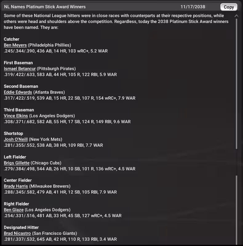 The Royals advance to their seventh World Series appearance, looking for their first win after two losses in the Colin Stewart era. They will take on the Los Angeles Dodgers in a World Series match up first. The Dodgers (100-62) had the best offense and the second best defense in the National League, and beat the Royals 2-1 in the regular season series, giving them home advantage. Their batting line up is led by their 2035 1st round draft pick, SS Vince Elkins, who averaged .308, hit 55 HRs, and had 149 RBIs. Rusty Kopp, two-time Platinum Stick at SS is their DH, and hit .297 while driving in 97 runs. On the pitching side, their rotation is led by 2027 1st round Mike Spence, who struck out 204 with a 2.58 ERA. If there is an opportunity, it comes with the 5th-ranked bullpen where only closer Zach Woodall managed an ERA below 3.50, recording 18 saves in 45 appearances. Game 1 in Los Angeles: Bogans vs. Mike Spence (2027 1st Round) Kansas City wins 8-7 Bogans: 5.1 IP, 6 H, 3 R Spence: 6 IP, 4 H, 4 R Jon Hall (W): 1.1 IP, 0 H, 0 R Zach Woodall (L)(BS): 1.0 IP, 4 H, 4R Banmei Kataoka SV): 1.0 IP 0 H, 0 R Kansas City HRs: Edgar Mir (1st Inning) Los Angeles HRs: Grady Emerson (1st Inning), Jaheem McCaster (2nd Inning), Juan Sosa (7th Inning, 2R) POTG: Mir (KC) 3-4, HR Game 2 in Los Angeles: Chafin vs. Dave van der Molen (2028 2nd Round) Los Angeles wins 8-6 Chafin: 4.1 IP, 8 H, 6 R Van der Molen: 6.1 IP, 3 H, 3 R Kataoka (L): 0.1 IP, 2 H, 2 R Woodall (W): 2.0 IP, 1 H, 0 R Kansas City HRs: Jon Basiliere (6th Inning), Mir (7th Inning, 3R) Los Angeles HRs: Vince Elkins (2nd Inning; 5th Inning), McCaster (2nd Inning, 2R), Ken Munden (9th Inning, 2R) 1-1 Series Tied Game 3 in Kansas City: Kim vs. Josh Contreras (2030 1st Round) Kansas City wins 8-4 Kim: 5.2 IP, 6 H, 3 R Contreras (L): 5.0 IP, 5 H, 4 R Jon Hall (W): 1.1 IP, 0 H, 0 R Kansas City HRs: Juan Soreni (1st Inning, 2R) Los Angeles HRs: Sosa (4th Inning) POTG: Soreni (KC): 1-4, HR, BB 2-1 Kansas City Game 4 in Kansas City: Baquerizo vs. Josh Cook (2036 Trade DET) Los Angeles wins 7-6 (15) Baquerizo: 6.0 IP, 2 H, 1 R Cook: 5.2 IP, 5 H, 5 R Kataoka (BS): 3.0 IP, 3 H, 1 R Andy Newsome (W): 1.1 IP, 0 H, 0 R Hall (L): 2.0 IP, 1 H, 1 R Los Angeles HRs: Elkins (8th Inning), Jon Conrad (15th Inning) POTG: Elkins (LAD) 5-6, HR 2-2 Series Tied Game 5 in Kansas City: Bogans vs Spence Los Angeles wins 7-6 Spence: 4.2 IP, 8 H, 5 R Bogans: 4.2 IP, 5 H, 2 R Jeremy Ervin (W): 2.0 IP, 1 H, 0 R Chris Wagner (BS): 2.0 IP, 3 H, 0 R Heaton (L)(BS): 0.2 IP, 1 H, 2 R Jeff Schever (SV): 0.2 IP, 0 H, 0 R POTG: Elkins (LAD): 2-4, BB 3-2 Los Angeles Game 6 in Los Angeles: Chafin vs. van der Molen Los Angeles win 4-2 Van der Molen: 5.1 IP, 5 H, 2 R Chafin (L): 7.2 IP, 5 H, 4 H Chase Colar (W): 0.2 IP, 0 H, 0 R Woodall (SV): 2.0 IP, 1 H, 0 R Kansas City HRs: Sam Hart (4th Inning) Los Angeles HRs: Anderson (5th Inning, 2R) 4-2 LOS ANGELES WINS Series MVP: Vince Elkins (LAD) The Royals come up short in the World Series, with the Series turning in game 4. The Royals leds in the 9th before losing in 15 and didnt win another game. There are several players out of contract this summer and there is definitely concern that this could be the window closing for the Royals. Bobby Witt Jr., it seems, will not earn a ring to end his career, which is the biggest disappointment of all. |