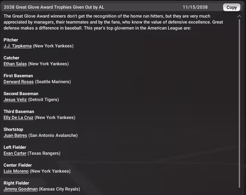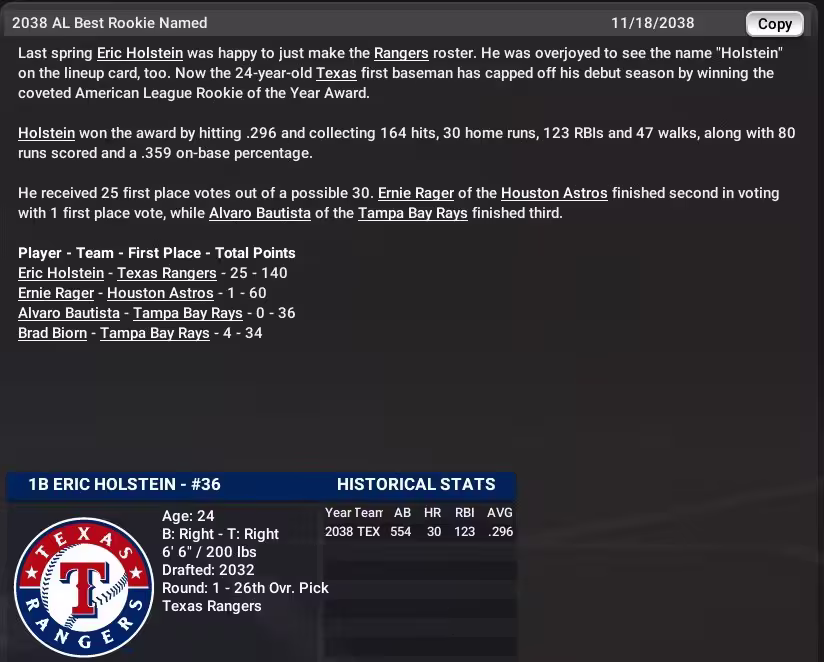 Joe Davis has completed his training in the development complex, and as you are aware, he has been working with staff to improve his strength and conditioning. Bobby Nickelberry has completed his training in the development complex, and as you are aware, he has been working with staff to improve his plate discipline. Jamie Edwards has completed his training in the development complex, and as you are aware, he has been working with staff to generate more batspeed and homerun power. Chase Standberry has completed his training in the development complex, and as you are aware, he has been working with staff to generate more batspeed and homerun power. Jon Basiliere has completed his training in the development complex, and as you are aware, he has been working with staff to generate more batspeed and homerun power. Bob Morrison has completed his training in the development complex, and as you are aware, he has been working with staff to improve his quality of contact. Humberto Bustillos has completed his training in the development complex, and as you are aware, he has been working with staff to improve his quality of contact. Eric Jones has completed his training in the development complex, and as you are aware, he has been working with staff to improve his pitch control. Dan Carrig has completed his training in the development complex, and as you are aware, he has been working with staff to improve his secondary pitch. No noticeable changes. Alvaro Baladez has completed his training in the development complex, and as you are aware, he has been working hard with staff to improve his secondary pitch. Potential slider stuff improves by <5 Current slider stuff improves by <5 EthanChafin has completed his training in the development complex, and as you are aware, he has been working hard with staff to improve his strength and conditioning. Successful Billy Mumaugh has completed his training in the development complex, and as you are aware, he has been working hard with staff to improve his strength and conditioning. Proneness improves from Somewhat Fragile to Somewhat Normal Potential power rating improves by <5 Preseason & Spring Training The Royals start 3-0-2 in Spring Training with even more flexibility inserted into position players for this year. Transactions & Injuries Tuesday, February 1st , 2039 Signed international amateur C Nelson Canjura out of Venezuela to a minor league contract with a $1,400,000 signing bonus. Thursday, February 24th , 2039 Purchased the contract of C Juan Carrillo from Double A Northwest Arkansas. Purchased the contract of 3B David Estrada from Triple A Omaha. Purchased the contract of SS Nate Williams from Triple A Omaha. Purchased the contract of CF Esteban Medina from Triple A Omaha. Purchased the contract of CF Chase Standberry from Triple A Omaha. Purchased the contract of SP Joe Davis from Triple A Omaha. Purchased the contract of SP Dan Carrig from Triple A Omaha. Purchased the contract of SP Omari Hammie from Triple A Omaha. Purchased the contract of RP David Vela from Triple A Omaha. Purchased the contract of RP Jeremy Miller from Triple A Omaha. Purchased the contract of RP Luis Dillard from Triple A Omaha. Purchased the contract of RP Art Putney from Triple A Omaha. Purchased the contract of RP Jamie Baggett from Double A Northwest Arkansas. Purchased the contract of RP Dan Acton from Triple A Omaha. |