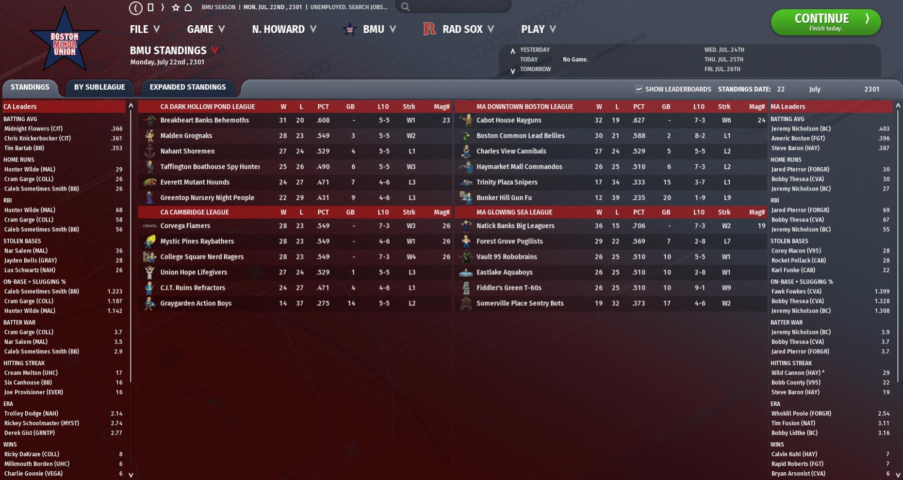 BNN Weekly Report This Week in the CBO, BMU, and GBRL by Nat Wright-Kawolski 5 August 2301 Players of the Week Engill Selected Top Performer in NCA: Austin Engill has the tools to stick in this league for many years. The 23-year-old shortstop of the Abernathy Adamantium had a hot bat in the North Charles Association over the past seven days and won the Player of the Week honors. Engill batted .500 with 10 hits in 20 at-bats, 2 home runs and 8 RBIs. This season Engill has hit at a .290 clip with 72 RBIs, 22 home runs and 69 runs scored. Fugivmee Week's #1 Player: It's always a thrill for fans of the team and students of the game alike when a superstar in the making shows what he's got. Deerlord Fugivmee, the Roxbury Rad Sox 22-year-old third baseman, put himself in the spotlight last week making him the clear-cut choice for South Charles Association Player of the Week honors. He ripped 11 hits in 22 at-bats, compiling a .500 average with 2 home runs and 4 RBIs. This season Fugivmee is batting .270 with 24 RBIs, 49 runs scored and 2 home runs. Transactions Monday, August 5th , 2301 University Point Deathclaws: Released RP Josh Hollander. Salem Witch Hats: Activated SP Terrence Artman from the restricted list. Salem Witch Hats: Activated 1B Antonio Toeclaw from the restricted list. Salem Witch Hats: Activated 3B Newspaper Turnbull from the restricted list. Salem Witch Hats: Activated RF Chris Treestump from the restricted list. Salem Witch Hats: Sent RF Chris Treestump to Triple A Breakheart Banks for injury rehab. Salem Witch Hats: Released 3B Johnny Tattooman. Jamaica Plain Red Rockets: Activated 2B Alan Setter from the injured list. Nordhagen Beach Party Boys: Placed SP Julian Shed on the 60-day injured list. Concord Radstags: Signed free agent 1B Clap Homestead to a minor league contract. Nordhagen Beach Party Boys: Signed RP Josh Maney. Concord Radstags: Released 1B Clap Homestead. Sunday, August 4th , 2301 Salem Witch Hats: Placed SP Tony Bertha on the 7-day injured list, retroactive to 08/03/2301. Nordhagen Beach Party Boys: Placed 3B Dirty Dog Sapienza on the 60-day injured list. Saturday, August 3rd , 2301 FHE Yao Guai: Activated RP Gabe Faulhaber from the injured list. FHE Yao Guai: Sent RP Gabe Faulhaber to Triple A Eastlake for injury rehab. FHE Yao Guai: Released RP Josh Maney. Quincy Gunners: Activated CL Wick Prater from the 60-day injured list. Quincy Gunners: Sent CL Wick Prater to Triple A Bunker Hill for injury rehab. The Slog Ghouls: Activated SS Lernz Tentsleep from the 60-day injured list. The Slog Ghouls: Sent SS Lernz Tentsleep to Triple A Everett for injury rehab. Friday, August 2nd , 2301 Goodneighbor Hancocks: Activated RP George Cincinnatus from the injured list. FHE Yao Guai: Activated RP Earcorn Eichorn from the injured list. FHE Yao Guai: Sent RP Earcorn Eichorn to Triple A Eastlake for injury rehab. Oberland T-51s: Placed 3B Ryan Bale on the 7-day injured list, retroactive to 07/30/2301. Thursday, August 1st , 2301 Starlight Lady Killers: Placed SP Ray Human on the 7-day injured list, retroactive to 07/31/2301. Starlight Lady Killers: Released C Felix Medina. County Crossing Bloodbugs: Released 1B Edgar Saldana. Roxbury Rad Sox: Released 1B Humpty Certified. Lexington Synths: Activated RP Greg Mardis from the 60-day injured list. Lexington Synths: Sent RP Greg Mardis to Triple A Union Hope for injury rehab. Lexington Synths: Released RP Todd Westland. Wednesday, July 31st , 2301 Oberland T-51s: Activated RP Chad Adamczyk from the injured list. The Salem Witch Hats traded 21-year old minor league CF Ed Dee Sullivan and a 6th round draft pick to the Lexington Synths, getting 24-year old SS Swift Hendrix and a 9th round draft pick in return. The County Crossing Bloodbugs traded 21-year old minor league CF Sharkey Lurkfodder to the Sunshine Tidings Chemists, getting 23-year old RHP Mike Koenig, 37-year old RHP Wally Hall, and a 4th round draft pick in return. Tuesday, July 30th , 2301 Vault 81 Dwellers: Placed CF Aesed Hayjen on the 7-day injured list, retroactive to 07/27/2301. County Crossing Bloodbugs: Released 1B Clap Homestead. FHE Yao Guai: Released LF Adam Crook. Egret Ninjas: Placed RP Matt Duty on the 7-day injured list, retroactive to 07/27/2301. Warwick Mirelurks: Placed SP Brian Bridges on the 60-day injured list. Warwick Mirelurks: Signed RP Blake Rollie. The University Point Deathclaws traded 23-year old C Paul Tracy to the The Slog Ghouls, getting 34-year old RHP Matt Suds in return. Standings Team Power Rankings Weekly Team Power Rankings: Here are the current team power rankings for Commonwealth Baseball Organization: Teams (Total Points, Tendency): 1) Nordhagen Beach Party Boys (135.9, o) 2) Atom Cats (115.4, ++) 3) Diamond City Swatters (115.4, +) 4) University Point Deathclaws (113.5, -) 5) Concord Radstags (109.2, -) 6) County Crossing Bloodbugs (105.1, ++) 7) Vault 81 Dwellers (104.3, -) 8) Salem Witch Hats (102.2, ++) 9) Starlight Lady Killers (95.1, --) 10) Fort Hagen Silver Shroud (95.1, --) 11) Abernathy Adamantium (93.1, ++) 12) Jamaica Plain Red Rockets (93.0, ++) 13) Egret Ninjas (92.0, +) 14) Quincy Gunners (91.0, -) 15) FHE Yao Guai (88.0, --) 16) Goodneighbor Hancocks (83.0, --) 17) Oberland T-51s (77.8, o) 18) Easy Town Assaultrons (74.9, --) 19) Finch Farm Four Leafs (73.6, o) 20) The Slog Ghouls (70.7, o) 21) Sunshine Tidings Chemists (62.5, +) 22) Lexington Synths (62.4, +) 23) Roxbury Rad Sox (53.4, -) 24) Warwick Mirelurks (52.2, o) Analysis Playoff information below: Playoff Picture Through 88 Games NCA: 1. Nordhagen Beach (Playoff Magic Number = 4) - Playoff chances = 100% 2. Concord - Playoff chances = 93.3% 3. Salem - Playoff chances = 82.0% 4. Abernathy (Better league record than Starlight) - Playoff chances = 51.4% 5. County Crossing (head-to-head tiebreaker over Starlight) - Playoff chances = 76.8% Close: 6. Starlight - Playoff chances = 55% 7. Fort Hagen - Playoff chances = 40.7% Outside Looking In: 8. Easy Town (Magi