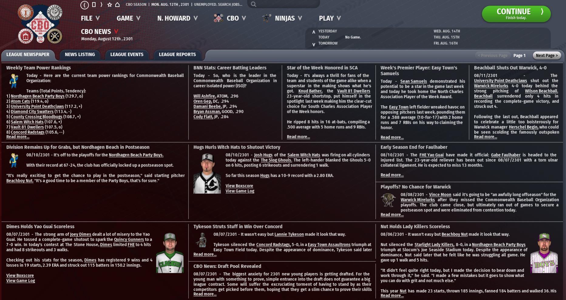 BNN Weekly Report This Week in the CBO, BMU, and GBRL by Nat Wright-Kawolski 12 August 2301 Players of the Week Week's Premier Player: Easy Town's Samuels: Sean Samuels demonstrated his potential to be a star in the game last week and today he took home the North Charles Association Player of the Week Award. The Easy Town left fielder wreaked havoc on opposing pitchers last week, pounding them for a .588 average (10-for-17) with 2 home runs and 7 RBIs on his way to claiming the honor. So far this year Samuels is hitting .287 with 11 home runs. Star of the Week Honored in SCA: It's always a thrill for fans of the team and students of the game alike when a superstar in the making shows what he's got. Knud Bather, the Vault 81 Dwellers 23-year-old shortstop, put himself in the spotlight last week making him the clear-cut choice for South Charles Association Player of the Week honors. He ripped 8 hits in 16 at-bats, compiling a .500 average with 5 home runs and 9 RBIs. Bather's current batting average stands at .269 and he has chalked up 22 home runs and 67 RBIs. Transactions Monday, August 12th , 2301 The Slog Ghouls: Placed RF Boots Yellowhair on the 7-day injured list, retroactive to 08/09/2301. FHE Yao Guai: Signed free agent C Twisted Bree Schneider to a minor league contract. FHE Yao Guai: Released C Twisted Bree Schneider. Sunday, August 11th , 2301 Lexington Synths: Activated CF Mike Pigeonfoot from the injured list. Lexington Synths: Sent CF Mike Pigeonfoot to Triple A Union Hope for injury rehab. Saturday, August 10th , 2301 FHE Yao Guai: Placed RP Gabe Faulhaber on the 60-day injured list. Fort Hagen Silver Shroud: Activated SP Mike Cartrette from the injured list. Fort Hagen Silver Shroud: Sent SP Mike Cartrette to Triple A C.I.T. Ruins for injury rehab. Egret Ninjas: Signed free agent 3B Tommy Talkington to a minor league contract. FHE Yao Guai: Signed RP Josh Hollander. Egret Ninjas: Released C Twisted Bree Schneider. Thursday, August 8th , 2301 FHE Yao Guai: RP Gabe Faulhaber returns from his rehab assignment. Roxbury Rad Sox: Placed SS Newscap Woldorf on the 7-day injured list, retroactive to 08/07/2301. Easy Town Assaultrons: Signed free agent 1B Clap Homestead to a minor league contract. Easy Town Assaultrons: Released 1B Clap Homestead. Wednesday, August 7th , 2301 FHE Yao Guai: RP Earcorn Eichorn returns from his rehab assignment. Starlight Lady Killers: Activated SP Ray Human from the injured list. FHE Yao Guai: Released 3B Tommy Talkington. Tuesday, August 6th , 2301 Vault 81 Dwellers: Activated CF Aesed Hayjen from the injured list. Vault 81 Dwellers: Sent CF Aesed Hayjen to Triple A Vault 95 for injury rehab. Vault 81 Dwellers: Released SS Jake Page. Roxbury Rad Sox: Signed free agent SS Jake Page to a minor league contract. Standings Team Power Rankings Weekly Team Power Rankings: Here are the current team power rankings for Commonwealth Baseball Organization: Teams (Total Points, Tendency): 1) Nordhagen Beach Party Boys (129.7, o) 2) Atom Cats (119.4, o) 3) University Point Deathclaws (117.2, +) 4) Diamond City Swatters (113.4, -) 5) County Crossing Bloodbugs (108.7, +) 6) Salem Witch Hats (107.6, +) 7) Vault 81 Dwellers (107.5, o) 8) Concord Radstags (105.6, --) 9) Jamaica Plain Red Rockets (99.9, ++) 10) Abernathy Adamantium (93.8, +) 11) Fort Hagen Silver Shroud (93.8, -) 12) Starlight Lady Killers (91.8, --) 13) FHE Yao Guai (90.0, +) 14) Easy Town Assaultrons (84.1, ++) 15) Egret Ninjas (82.1, -) 16) Quincy Gunners (82.1, -) 17) Goodneighbor Hancocks (80.1, -) 18) Oberland T-51s (74.4, -) 19) Lexington Synths (73.7, ++) 20) Finch Farm Four Leafs (70.6, -) 21) Roxbury Rad Sox (69.7, +) 22) The Slog Ghouls (65.5, -) 23) Sunshine Tidings Chemists (51.8, -) 24) Warwick Mirelurks (44.3, o) Analysis Playoff information below: Playoff Picture Through 93 Games NCA: 1. z-Nordhagen Beach (League Magic Number = 1) 2. Concord - Playoff chances = 94.0% 3. Salem - Playoff chances = 86.1% 4. County Crossing - Playoff chances = 91.2% 5. Fort Hagen (Better league record than Abernathy and Starlight)- Playoff chances = 41.7% Close: 6. Starlight (Better league record than Abernathy) - Playoff chances = 48.9% 7. Abernathy - Playoff chances = 37.1% Outside Looking In: 8. Easy Town (Magic number to elimination - 12) 9. The Slog (Magic number to elimination - 5) 10. Finch Farm (Magic number to elimination - 4) 11. Lexington (Magic number to elimination - 2) 12. Sunshine Tidings (Magic number to elimination - 1) SCA: 1. University Point - Playoff chances = 100% 2. Diamond City - Playoff chances = 100% 3. Atom - Playoff chances = 100% 4. Vault 81 - Playoff chances = 100% 5. Jamaica Plain - Playoff chances = 66.3% Close: 6. FHE (best record in head-to-head series over Goodneighbor, Quincy, and Jamaica Plain) - Playoff chances = 19.7% 7. Egret (best record in head-to-head series over Goodneighbor and Quincy) - Playoff chances = 6.2% 8. Goodneighbor (2nd best record in head-to-head series over Quincy) - Playoff chances = 4.3% 9. Quincy - Playoff chances = 3.5% Outside Looking In: 10. Oberland (Magic number to elimination - 8) 11. Roxbury (Magic number to elimination - 3) 12. e-Warwick Minor League Report BMU DeYoe Punishes CA Pitchers This Week: So far in his young career, Ralph DeYoe has kept a low profile, but after his performance at the plate last week, he attracted the notice of the rest of the Commonwealth Association in a big way as he was named the Player of the Week today for his efforts. The 22-year-old Greentop Nursery Night People center fielder hit at a torrid .474 clip as he collected 9 hits in 19 at-bats, 4 home runs, 10 RBIs and 6 runs scored. DeYoe is hitting .293 this year with 14 home runs and 46 RBIs. He also has an OBP of .327, 13 walks and scored 36 times. MA Announces Player of the Week: Michaelangelo Sandifer has the tools to stick in this league for many years. The 23-year-old right fielder of the Natick Banks Big Leaguers had a hot bat in the Massachusetts Associ