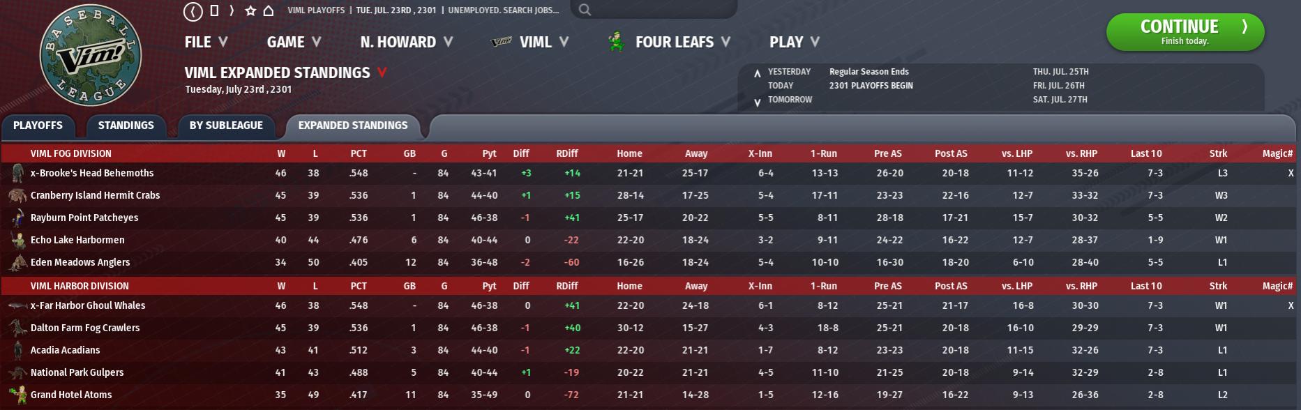 ---------------------------------------------------------- Nuka News Update Reporting on the NWL, NWLB, and APYL Leagues by Evan Guy Standings Transactions Tuesday, July 23rd , 2301 Cherry Ghoulrillas: Signed free agent RP Dave Fogg to a minor league contract with a $72 signing bonus. Monday, July 22nd , 2301 Grape Painted Ghouls: Activated 2B Brenton Laboe from the injured list. Quantum Nukalurks: Activated LF Poop Strohbehn from the injured list. Sunday, July 21st , 2301 Orange Tourists: Signed free agent RP Evan Batiste to a minor league contract with a $72 signing bonus. Quartz Star Force: Placed SS Marmalot Hooch on the 7-day injured list, retroactive to 07/18/2301. Saturday, July 20th , 2301 Wild Gatorclaws: Placed SP Kent Rutledge on the 60-day injured list. Friday, July 19th , 2301 Grape Painted Ghouls: Activated RP Blake Johnson from the injured list. Orange Tourists: Released SS Nick Timmerman. Thursday, July 18th , 2301 Wild Gatorclaws: 3B Ryan Bobb returns from his rehab assignment. Quartz Star Force: Signed free agent RP Chris Bookcase to a minor league contract with a $60 signing bonus. Orange Tourists: Released RP Yunpup Staples. Quartz Star Force: Released RP Blake Rollie. Wednesday, July 17th , 2301 Grape Painted Ghouls: Placed 2B Brenton Laboe on the 7-day injured list, retroactive to 07/16/2301. Tuesday, July 16th , 2301 Wild Gatorclaws: Signed free agent RP Pose LaRose to a minor league contract with a $324 signing bonus. Wild Gatorclaws: Released RP Joe Knight. Playoffs Preview NWLB Final Standings NWLB News: Playoffs begin: With the playoffs mere hours away, each of the contenders are putting their game faces on. It's time for ballplayers to leave it all on the field. In the NWL B League playoffs, miracles do happen, but most often it's simply the team that plays better baseball that goes home with the prize -- the much-coveted Nuka B Series championship. The Nuka B Series starts today with these games: Quantum B Nukalurks vs Grape B Painted Ghouls. APYL News Season Complete ---------------------------------------------------------- Vim! View Veracious, Vivacious, Vainglorious Vision of the Vim! Leagues by Vikky Vail Standings Transactions Tuesday, July 23rd , 2301 Grand Hotel Atoms: Placed CF Mike Troop on the 7-day injured list, retroactive to 07/22/2301. Monday, July 22nd , 2301 Dalton Farm Fog Crawlers: Activated SP Rick Hat from the injured list. Dalton Farm Fog Crawlers: Released RP Josh Windom. Echo Lake Harbormen: Signed free agent 2B Trevor Colorado to a minor league contract. Grand Hotel Atoms: Signed free agent 3B Brad Gossiper to a minor league contract. VIML's #1 Player Named: Jared Herdman of the Rayburn Point Patcheyes might have lost a step over the years, but the 35-year-old second baseman can still get it done. He beat out several other worthy Vim! League hitters over this past week to claim the Player of the Week Award. Herdman posted a .571 batting average with 2 home runs and 5 RBIs last week while scoring 8 runs. For the week he was 12 for 21. So far this year Herdman has 18 home runs and a .331 batting average. Sunday, July 21st , 2301 Echo Lake Harbormen: Signed free agent SP Tom Blanks to a minor league contract with a $8,500 signing bonus. Echo Lake Harbormen: Released RP Ethan Tarberry. Friday, July 19th , 2301 Grand Hotel Atoms: Signed free agent RP Glowbug Pena to a minor league contract with a $8,000 signing bonus. Grand Hotel Atoms: Released RP Mann Pratt. Wednesday, July 17th , 2301 Acadia Acadians: Signed free agent RP Driver Kahrs to a minor league contract with a $11,000 signing bonus. Acadia Acadians: Released RP Noah Baird. Tuesday, July 16th , 2301 Rayburn Point Patcheyes: Signed free agent RP Dog McMurray to a minor league contract with a $8,000 signing bonus. Echo Lake Harbormen: Released RP Edie Medowe. Dalton Farm Fog Crawlers: Signed free agent 3B Jim Pearpeel to a minor league contract. Playoffs Preview VIML AAA News Season Complete MYL News Season Complete