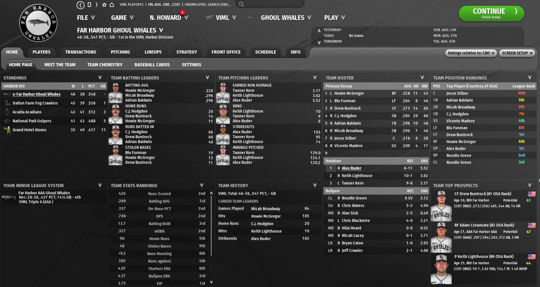 As of right now, their biggest issue would seem to be pitching talent. However, that is not the case! Their offense is absolutely killing them. I will post their team home page below, and if you look on the right at the Team Position Rankings, you will see that they are in the orange or red at almost every position. That's current, but the hidden is that several players on the list just need to develop: C Blitzen Rosetta (62 POT), 2B Danny Suarez (53), and SS Tib Shorthop (65). They also drafted RF Orcin Cardinal 1st overall (79); have SS Pipe Wallcrawler (65) and 1B Rotten Gaziano (57) in the GBRL; and have CF Base McAndrews (58) not far away from a call-up. For pitching, SP Trolley Dodge (70) and SP Isaiah Swindler (65) are both currently starting and struggling at the CBO level, but they seem that they can be better pitchers. At the minor level, only SP Punky Shaum looks to be a potential CBO starter, so they really need to acquire more pitching talent. Regarding more talent, this next week is trade deadline week, so I am going to start assessing needs for playoff contenders. That means that Finch Farm may be able to offload at least one of its players trending downwards: 3B Peter Tatoeater. If I were GM Jason Thompson, I would try to hold on to some of the young talent, like RF Matt Basile, and good producers, like 1B Joe Mahaney. Quick edit: SP Trolley Dodge is not really struggling: 3-4, 2.94 (7 GS, 8 App) is pretty good.