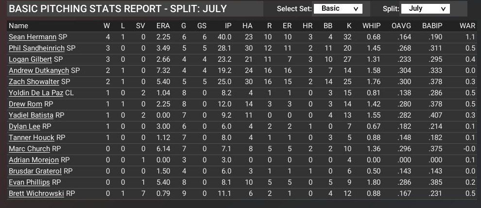 Starting Pitcher of the Month: Sean Hermann -- The 27-year-old right-hander went 4-1 in six starts with a 2.25 ERA He pitched 40.0 innings, during which he struck out 32 and had a 0.88 WHIP. Relief Pitcher of the Month: Brett Wichrowski -- The 27-year-old right-hander got into nine games and went 0-1 with seven saves and a 0.79 ERA. In 11.1 innings, he struck out 12 and had a 0.88 WHIP. |