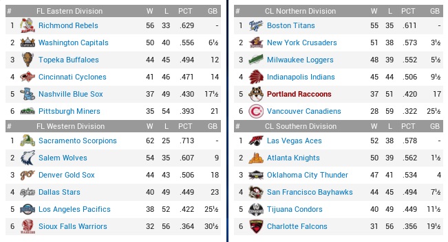 Milwaukee’s Ian Coleman (.356, 3 HR, 50 RBI) was named MVP of the All Star Game as the Continental League beat the Federal League, 5-3. Coleman drove in the winning runs with a 3-run home run off the Scorpions’ Ian Rutter in the fourth inning. DEN Mike Bednarski and CIN Eddie Moreno were the only other players with multiple base hits in the game, with Coleman overall going 2-for-3 with a walk.