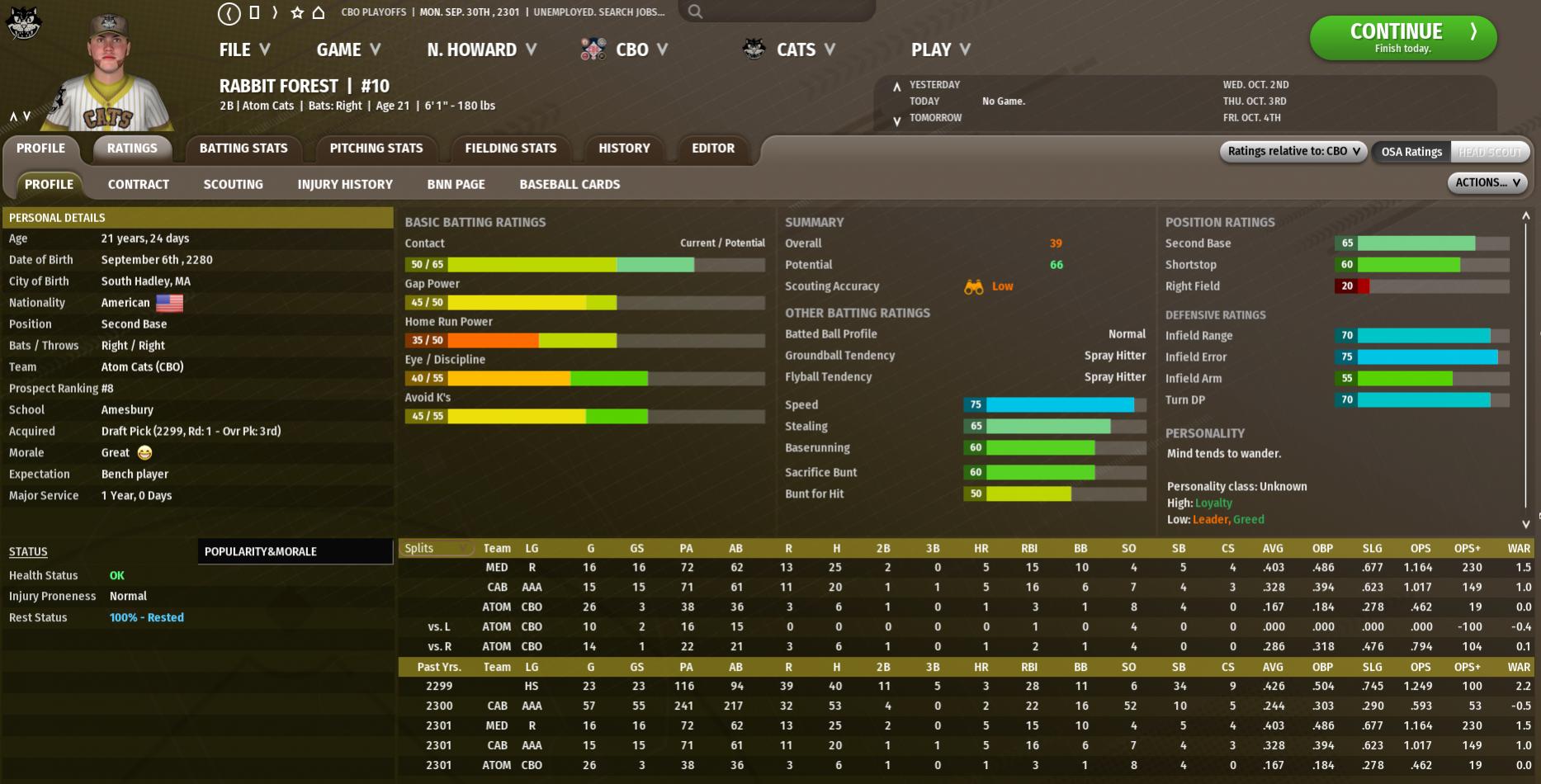 Drafted 3rd overall by the Atom Cats in the 2299 Rookie Draft out of the Boston Youth Development League's Green Future Sea Urchins, Forest is more known for two things: defense and speed. The middle infielder started in 2300 with the Cabot House Rayguns of the BMU, reaching a .244/.303/.290 line in 55 starts. Considered a good spray hitter, he could not quite get a grasp of some advanced pitching in 2300. In 2301, he moved around to every level with the Atom Cats. In 16 games with the Medford Medics of the Greater Boston Rookie League, Forest tore it up with a .403/.486/.677 line. He found success, too, with Cabot House, with a .328/.394/.623 line. Between the two teams, he also jacked 10 over the fence and drove in 31. He was developing nicely, but there were problems in Atom began when starter Pat Shammo went down with a major injury on August 11. Shammo had bounced around between Cabot House and the Cats since being drafted in the 21st round of the 2296 Inaugural Draft. He had not had significant starting time with the Atom Cats since the 2298 season when he started 41 games. In 2301, he had respectable numbers, batting .242 with 6 home runs and 32 RBI. Still, his injury was devastating for the lineup at the time. Chris Shleedoodle started the season as the starter, but he struggled and was replaced by Shammo. After Shammo went down, the Cats again tried to make him the starter but saw that the 35-year-old just did not have it. That meant the call up for their youngster Rabbit became a new starter positon. Shleedoodle was sent to Cabot House for the final three games of the season, and stayed there once the playoffs began. He finished the season with a .170 average, 2 home runs, and 8 RBI in 25 appearances with 14 starts. With the Cats, Forest appeared in 26 games, mostly as a late defensive replacement or pinch hitter. With three starts, he hit merely .167 with a homer and three RBI. However, he has turned it on a bit more in the playoffs. Against Diamond City, he collected six hits (all singles) in 17 at bats (.353). He scored twice and knocked in one. In five games versus University Point, Forest went 7 for 21 (.333) with a three-hit game in Game 1, a double, three runs scored, and three RBI. In Game 1 versus Nordhagen Beach, he was 1 for 3 with a double. He is now hitting .341 in the playoffs, making him a key contributor. We shall see if he turns on his star power for the rest of the series to propel his Cats to a party at the Garage!