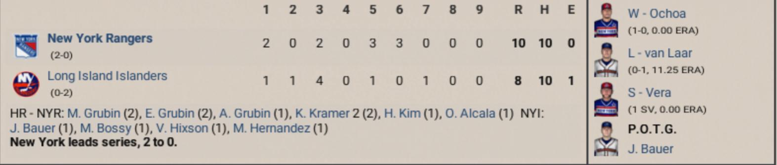 By J. Peterman It was a crisp autumn evening at UBS Arena, the kind that smells faintly of roasted chestnuts and bitter defeat. I found myself seated in section 102, sipping a beverage that was, shall we say, more cola than spirit, as the Rangers of New York squared off against their cross-sound nemeses, the Islanders of Long Island. Ah, the tension. The scent of salted pretzels, the gleam of sharpened skates, the soft rustle of polyester jerseys stretched over paunchy midsections. And amidst this Shakespearean canvas of competition, there unfolded a spectacle. A duel not of swords, but of bats—bludgeons, really—each one delivering stinging blows to the fragile hopes of the other. The final tally: Rangers 10, Islanders 8. But this was no mere number. This was a symphony of violence—a home run bacchanalia, the likes of which would make the Colossus of Rhodes blush with admiration. Eleven home runs rained down from the heavens. Seven for New York, four for Long Island. It was less a baseball game than an air raid. Jack Bauer, Long Island’s iron-fisted sentinel at shortstop, struck with the precision of a Swiss timepiece. Four hits, five runs batted in, and a glare that could curdle milk. But he was outdone—yes, outdone—by Kosmo Kramer, the Rangers’ enigmatic maestro of mischief. Two home runs, four runs driven in, and a trot around the bases that could only be described as... jazz in motion. And let us not forget Mike Bossy—elegant, fierce, a man whose cleats still echo with the thunder of past glories. Two hits, a home run, and three runs scored. He played as if auditioning for Valhalla itself. When asked about the win, Kramer merely smirked and intoned, “Winning the game is always the first objective.” Indeed, Kosmo. So is breathing, and yet few do it with such flair. Now the series shifts to Madison Square Garden—the world's most famous arena, where ghosts of pugilists and crooners still roam the rafters. The Rangers lead two games to none. But this story, dear reader, is far from over. As I adjusted my trench coat and stepped into the night, I thought only this: if baseball be the food of life, then tonight, we feasted. |