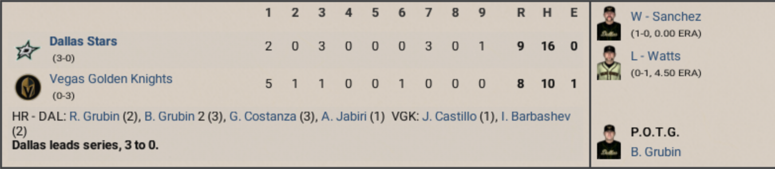 By Dexter Morgan There’s something strangely beautiful about a blowout — the sheer, unapologetic dominance of one side over the other. Like a perfectly planned execution. No wasted motion, no hesitation, just precision and inevitability. Tonight, the Dallas Stars were the predator. Vegas? The prey. Final score: Dallas 19, Vegas 7. Seventeen hits. Nineteen runs. Controlled chaos wrapped in pine tar and stitched leather. Dallas didn’t just beat Vegas. They dissected them. Cleanly. Efficiently. Brutally. It began in the bottom of the first — a surgical strike. Brayden Grubin, a name that deserves to be carved into the game’s ledger after tonight, delivered the opening incision: a two-run double. He wasn’t swinging for the fences. He was hunting a pitch, and when he found it, he made it bleed. Grubin finished 3-for-4 with a home run, a double, two walks, seven RBIs, and three runs scored. Excessive? Perhaps. But in his method, I saw a man not driven by ego… only the thrill of exacting impact. Then there was Amenzu Jabiri, gliding from base to base like a ghost in cleats. Three-for-three, two doubles, five runs scored, three walks. That’s not batting — that’s infiltration. He was everywhere, all at once. Always one step ahead. And George Costanza — two home runs, six RBIs, three runs scored. Irony? He always claimed to do the opposite of what instinct told him. Maybe that’s the secret: misdirection. While Vegas chased patterns, Costanza flipped the script. Vegas? They managed seven runs, but that was noise. Superficial movement. They bled early and never stopped. This was Game 1 of the Western Conference Semifinals. A best-of-seven series. And Dallas just threw the first punch — and it landed flush. Tomorrow, they do it again. The same park. The same opponent. Will Vegas adapt… or will Dallas finish the job? We'll find out. And I’ll be watching. |