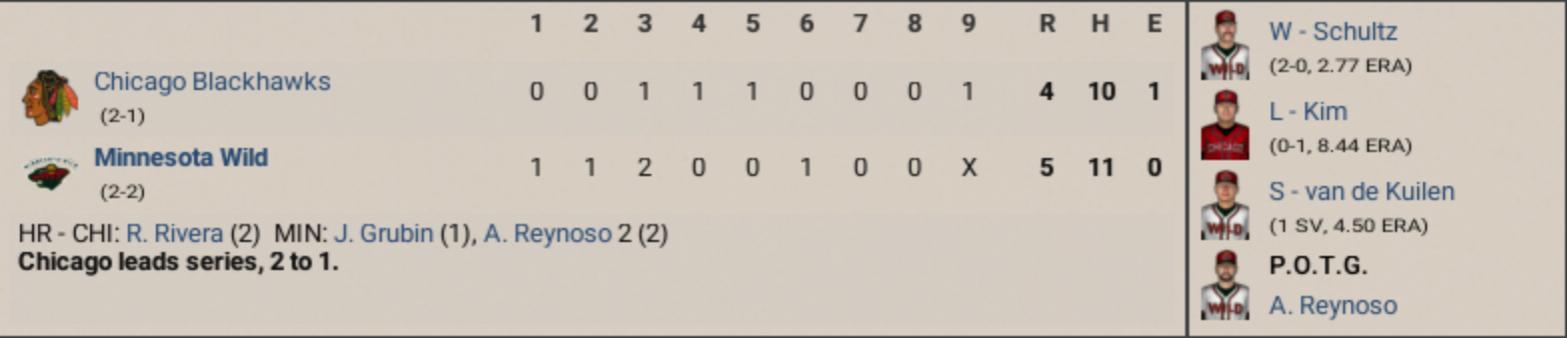 Xcel Energy Center — September 25, 2001 By Mike Ehrmantraut They say winning is a habit. So is losing. You choose which one you want to live with. The Minnesota Wild made their choice tonight. It wasn’t pretty. It didn’t need to be. It just needed to get done. And it did. 5-4. Ballgame. Let’s talk about Adrian Reynoso. The kid came into this game with something to prove. You could see it in his stance. In his eyes. Like he knew something nobody else did. He went 3-for-4 with two home runs, one in the second and another in the sixth. No wasted motion. No dramatics. Just cold execution. Then there’s the pitching. Dave Schultz, a professional’s professional. Seven innings, six hits, three runs, two walks, six strikeouts. He didn't overpower anyone. He didn’t have to. He let Chicago beat themselves. Walt van de Kuilen closed it out, even after getting knocked around a bit in the ninth. Still did the job. That’s what matters. On the other side, Connor Bedard tried to drag Chicago across the finish line by himself. Three doubles. Two RBIs. One man can't carry a team for long. I've seen that story play out too many times. It doesn’t end well. And let’s not forget the weather. Rain delay in the sixth. Fifteen minutes. Enough time for thoughts to creep in. That’s when you see what a team’s made of. Minnesota came back sharper. More focused. Chicago? Not so much. Now it’s 2-1 in the series. Minnesota isn’t dead. Far from it. They’re angry. They’re focused. They’re still standing. Game 4 is tomorrow. Same place. Same stakes. And if Chicago thinks Minnesota’s going to lie down, they weren’t watching tonight. That would be a mistake. One you don’t get to make twice. Last edited by jg2977; 07-03-2025 at 07:11 PM. |