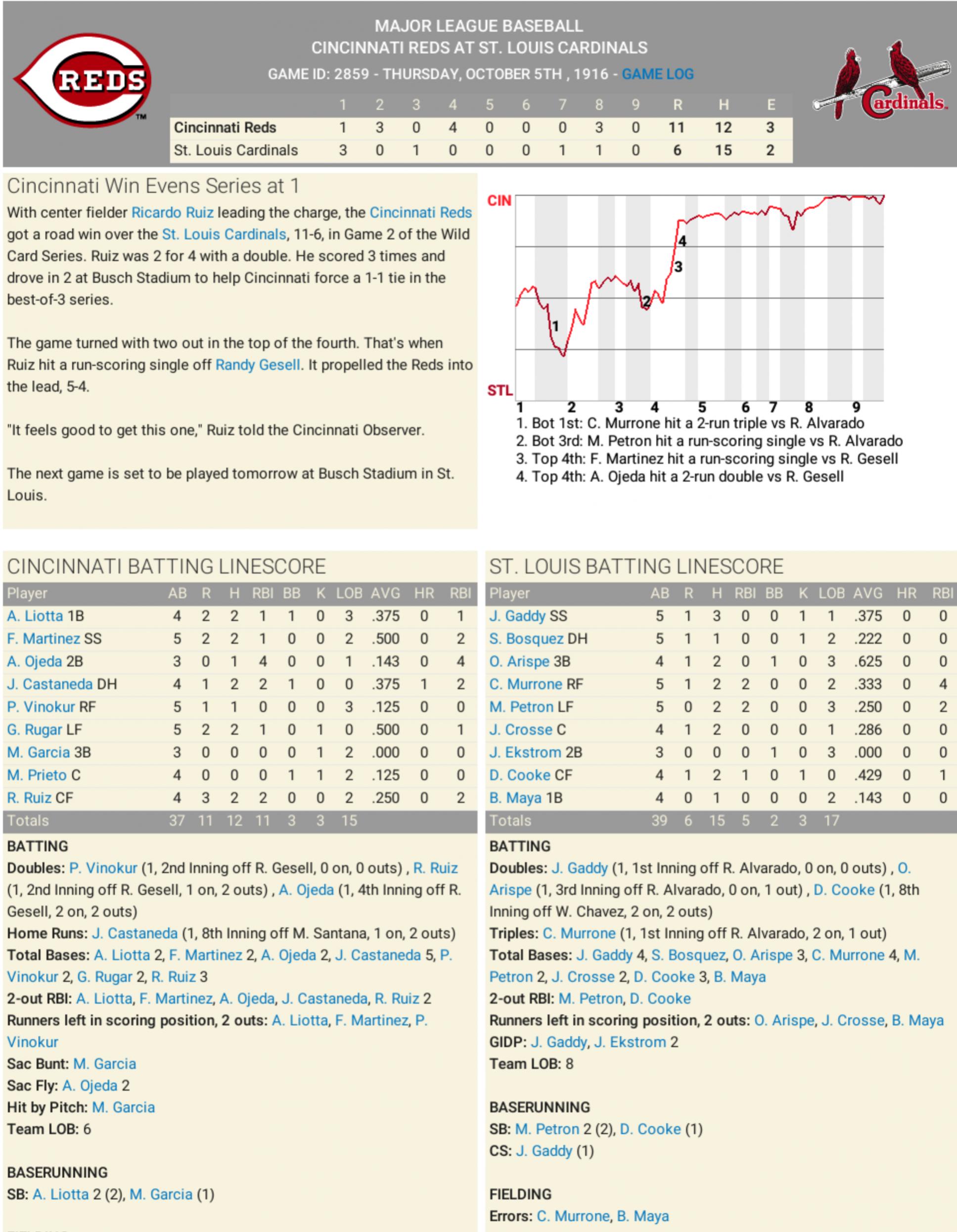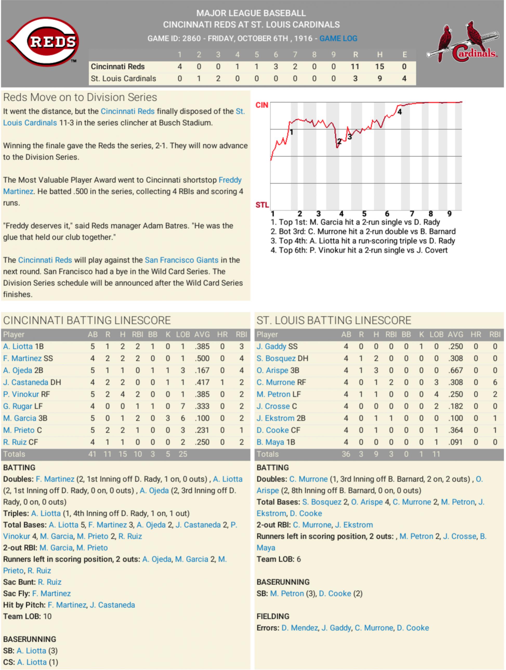 🎙️**"Hello everybody, Harry Doyle here coming to you live from Busch Stadium, where the St. Louis Cardinals' 1916 postseason run has officially flatlined faster than a rookie on his first trip to Vegas!"** Ohhh mercy—what a meltdown. The reigning World Series champs—yes, those very same St. Louis Cardinals—have been bounced from the postseason by none other than the division-rival Cincinnati Reds, who came into town like a wrecking ball and took no prisoners. Final score: Reds 11, Cardinals 3. That sound you hear? That’s the last of the champagne bottles being quietly rolled back into storage. It all started early, folks. Top of the first, Reds put up a crooked number—FOUR runs—before the peanut guy could get to section 203. Freddy Martinez ripped a double, Angelo Liotta followed with a triple, and by the time the Cardinals remembered what sport they were playing, it was already 4-0. And how about Freddy Martinez, ladies and gentlemen? The kid hit .500 in the series, drove in four, scored four, and basically lived in scoring position. Series MVP? You bet your keister. The glue that held the team together? He was the whole hardware store. Meanwhile, on the other side… the Cardinals looked like they were playing with oven mitts. Four errors. Count 'em—one, two, three, four! They kicked the ball around like it owed them money. The fielding was so bad, I thought I was watching Little League Night at the ballpark! And the pitching? Oh, sweet saint of lost causes. Starter Denny Rady was yanked in the fourth inning after giving up five runs on eight hits. His ERA? Let’s just say it’s somewhere between his social security number and a lottery ticket. Covert didn’t help, and Mendez… well, Mendez was there. Not sure what he was doing, but he was there. Meanwhile, Ben Barnard on the bump for Cincy went the distance. Nine full innings. No walks. One strikeout. Not exactly Nolan Ryan, but when your offense scores eleven, you just have to keep it between the lines and breathe through your nose. And give it up for Pat Vinokur—four hits, two ribbies, and a permanent lease on first base. The guy was hotter than a jalapeño in a sauna. So now, the Reds are off to face the San Francisco Giants in the Division Series, while the Cardinals are heading home—probably to a long winter of asking, “What just happened?” For the fans in St. Louis, it’s heartbreak. For the Reds? Well, I hope they packed sunscreen, 'cause this October run just got a whole lot sunnier. I’m Harry Doyle, saying “So long from Busch Stadium—where the beer’s cold, the defense is colder, and the Reds are movin’ on!” 🎙️**“And for the love of God, someone get a glove on the ball out there.”** |