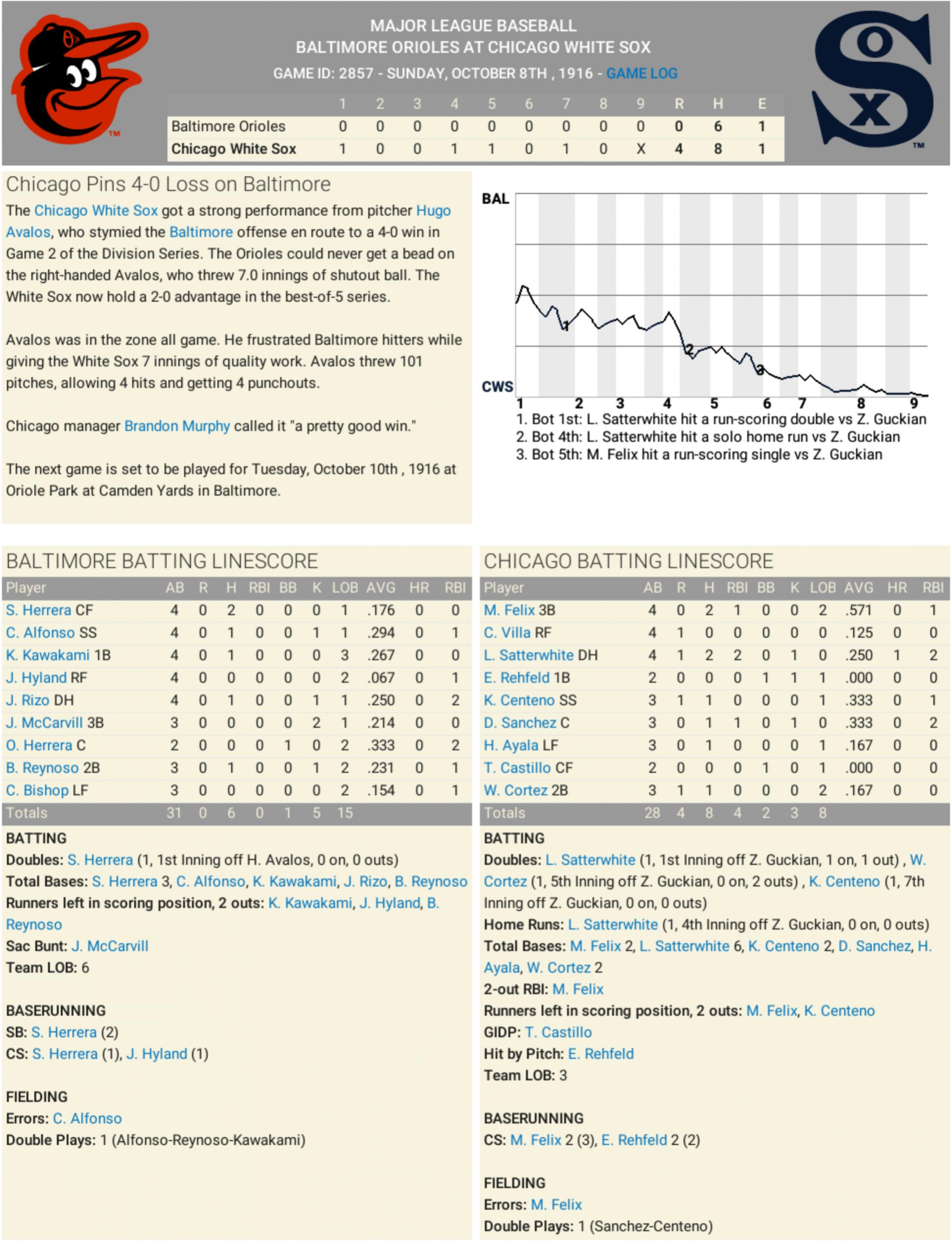 By The Baltimore Sun Staff | October 10, 1916 | Camden Yards BALTIMORE — In a game that hung on every pitch, it was the hometown faithful who erupted last, and loudest. Shortstop Chris Alfonso, quiet until it mattered most, delivered a clutch ninth-inning single to lift the Baltimore Orioles to a 3-2 walk-off victory over the Chicago White Sox on Tuesday afternoon at Oriole Park at Camden Yards. The win breathes life into Baltimore’s postseason, trimming Chicago’s lead in the American League Division Series to 2-1 and forcing a Game 4 on Wednesday. On a crisp October afternoon, it was left-hander Sal Cantu who set the tone for the Orioles. In front of 43,736 raucous fans, Cantu spun seven masterful innings, surrendering just two hits and two runs—only one of them earned—while keeping Chicago's bats quiet and the Birds’ hopes aloft. “I just tried to attack the bottom of the zone and keep it there,” Cantu said afterward, his voice low and calm in the postgame clubhouse. “That’s where we could win.” And win they did—with flair. After falling behind 2-0 in the fifth inning, the Orioles struck back immediately. A double by J. Rizo and a sharp RBI single from O. Herrera sparked a two-run rally to tie the game, igniting a crowd hungry for a postseason moment. From there, it became a battle of nerves. Reliever A. Jeoffrey worked two crucial shutout innings in relief of Cantu, stranding a pair of runners in the top of the ninth to preserve the tie and set the stage for a dramatic finish. In the bottom of the inning, it was Alfonso—already with two hits to his name—who stepped in with runners aboard and the season in the balance. He laced a 2-1 pitch into left field, sending Santiago Herrera racing home from third and bringing the dugout and the ballpark to life. “I was just thinking, ‘Put the ball in play. Make something happen,’” Alfonso said. “And then I heard the crowd. I’ll never forget that sound.” The win not only staves off elimination but shifts the series’ momentum back to Baltimore, who will host Game 4 with renewed energy and a resurgent belief in their own October destiny. A Look at the Numbers: Alfonso finished the day 3-for-5, driving in the winning run and raising his postseason average to .364. Cantu’s ERA through two playoff starts now sits at a stingy 0.64, further solidifying his postseason credentials. Rizo contributed two hits, including a double, while Hyland and McCarvill chipped in with timely production. The Orioles outhit the White Sox 8 to 4, and stranded nine men on base—a sign that despite the win, they’ll want more efficiency with runners in scoring position in Game 4. Looking Ahead: Game 4 is scheduled for tomorrow afternoon at Oriole Park. First pitch is set for 2:05 PM ET. The Orioles will need another strong showing to send this series back to Chicago for a decisive fifth game. The White Sox, meanwhile, will aim to close the door. For Baltimore, Tuesday was a victory defined not by dominance, but by heart—and the belief that October magic still resides at Camden Yards. “It’s not over,” Cantu said with a steady gaze. “Not even close.” |