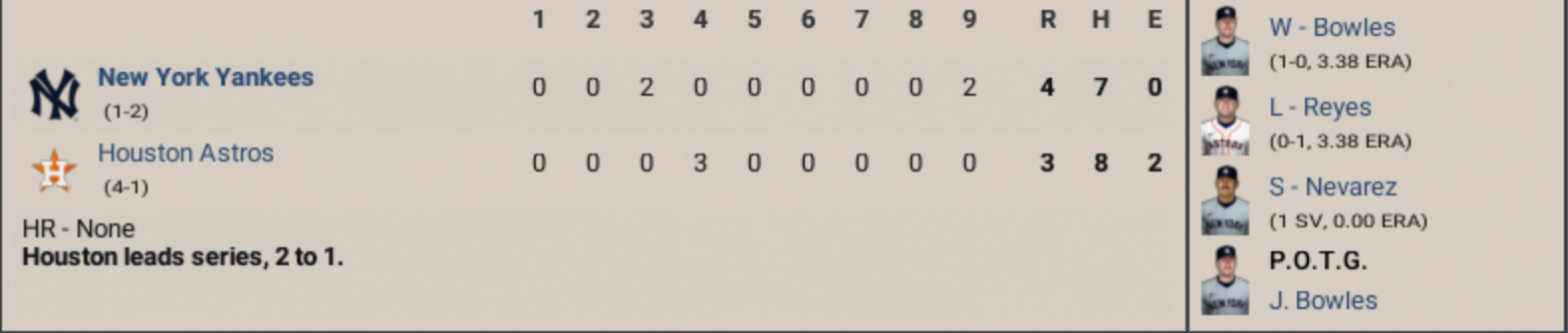By John Sterling, voice of the Yankees – October 10, 1916 HOUSTON — Ohhhhhh my! You can’t predict baseball! The New York Yankees, teetering on the edge of elimination, rose from the ashes in the ninth inning like a Broadway revival—and ladies and gentlemen, what a performance it was! They storm back to beat the Houston Astros, 4 to 3, in a heart-pounding Game 3 of the Division Series, and they live to fight another day! You talk about drama? You talk about grit? You talk about—Tom Buchanan?! Yes, the designated hitter, silent all night, came up in the ninth inning and wrote a new chapter in Yankees postseason lore—a TOM-TOM TRIPLE! He rips one into the gap in right-center, it rolls all the way to the wall, two runners score, and the Yankees... take the lead! Ohhhh, Tommy boy! He’s the Buchanan Brawler! Earlier in the game, it was Mark Crane—yes, MARK, not Clarke—who delivered a two-out RBI double to put the Yanks on the board in the third. And then came Jimmy Schultz, knocking in another with a base hit. Shackford was stackin' hits behind the plate, going 3-for-4 like he was calling a symphony from the batter’s box. But make no mistake, the man of the hour, the toast of the Bronx, the Bronx Bull himself—Justin Bowles! The righty went eight strong, grinding through Houston’s lineup like a metronome of menace. Eight innings, eight hits, but only three runs—and not a walk to be found. Now that’s a big-league effort! And then… enter Nevarez! Calm as a cab ride down 161st Street. One inning, three batters, boom-boom-boom—save number one, series still alive. Let’s talk about Minute Maid Park—it was loud, it was orange, it was buzzing—but the Bronx Bombers silenced the crowd in the ninth. A total gut punch to Houston, who were looking to sweep. Instead, the pinstripes bring the thunder, and we’ve got ourselves a series again! The Yankees now trail 2 games to 1, and folks, Game 4 is tomorrow! The Yankees will try to even things up, and if tonight is any sign of what’s to come, well... hold onto your hats! Because this one was... THEEEEEEEEEEEEEEEE YANKEES WIN!!! THAAAAAA YANKEES... WIIIIIIIIIIIIIIIIIIIIIIIN!!! Stay tuned for Game 4 action tomorrow right here on your home for October drama—and always remember: you can’t predict baseball, Suzyn... you just can’t. Last edited by jg2977; 07-12-2025 at 11:11 AM. |