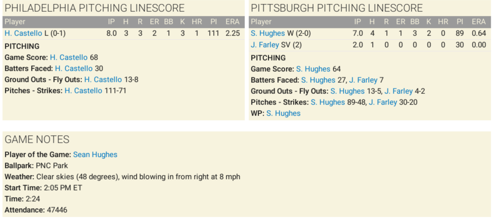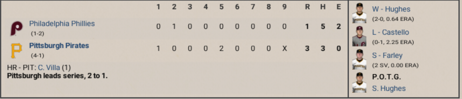 October 11, 1916 – PNC Park, Pittsburgh PHILLIES @ PIRATES — NLDS GAME 3 Alright people, fasten your seatbelts. Because what we just saw out there in Pittsburgh? That was a freaking clinic. Pittsburgh Pirates 3, Philadelphia Phillies 1. That’s the final, and lemme tell ya — the Buccos came in like they had serious attitude, and they just put Philly on their heels like a rookie trying to hit a Vaughn heater. Now listen up... Sean Hughes? The dude was ICE. Seven innings, four hits, gave up just one run, and that was basically on a soft jab. No homers, no damage. The guy didn’t even break a sweat. Like, if I threw a game like that back in the day? I’d be struttin’ off the mound like I owned the stadium. Which I usually did. And then Carlos Villa — BOOM! Fifth inning, one swing, two runs off Hector Castello. I don’t even think the ball's landed yet. It was gone, baby, gone. That one had vapor trails. I stood up in the press box and yelled “SEE. YOU. LATER.” Security didn’t love that, but hey — I’m Rick Vaughn. Meanwhile, Philly looked like they couldn’t hit water if they fell outta a boat. Hector Castello actually wasn’t bad — eight innings, only three hits, three runs (two earned), and one huge mistake — Villa’s bomb. But let’s be real, you can’t win if your bats are made of wet newspaper. Five hits, two errors... c’mon. You’re not gonna beat the Pirates sleepwalking like that. Offensive MVP? Villa, hands down. Defensive MVP? Nobody booted anything. Pirates were cleaner than a fresh shave. And the bullpen? Farley comes in and shuts the damn door. Two innings, zero drama. Just the way we like it. Pittsburgh now leads the series 2-1. One more win and they’re heading to the NLCS to face the Giants, who just steamrolled the Reds like a freight train full of angry rhinos. So the Pirates better keep this fire burning — because San Fran? They don’t mess around. Next game’s in Pittsburgh. If the Phillies don’t come in swinging like their careers are on the line? It’s curtains. Pack the bags. Book the tee times. This is Rick Vaughn, signing off. Keep it fast, keep it wild, and whatever you do — never hang a curveball to a guy named Villa. Trust me. |