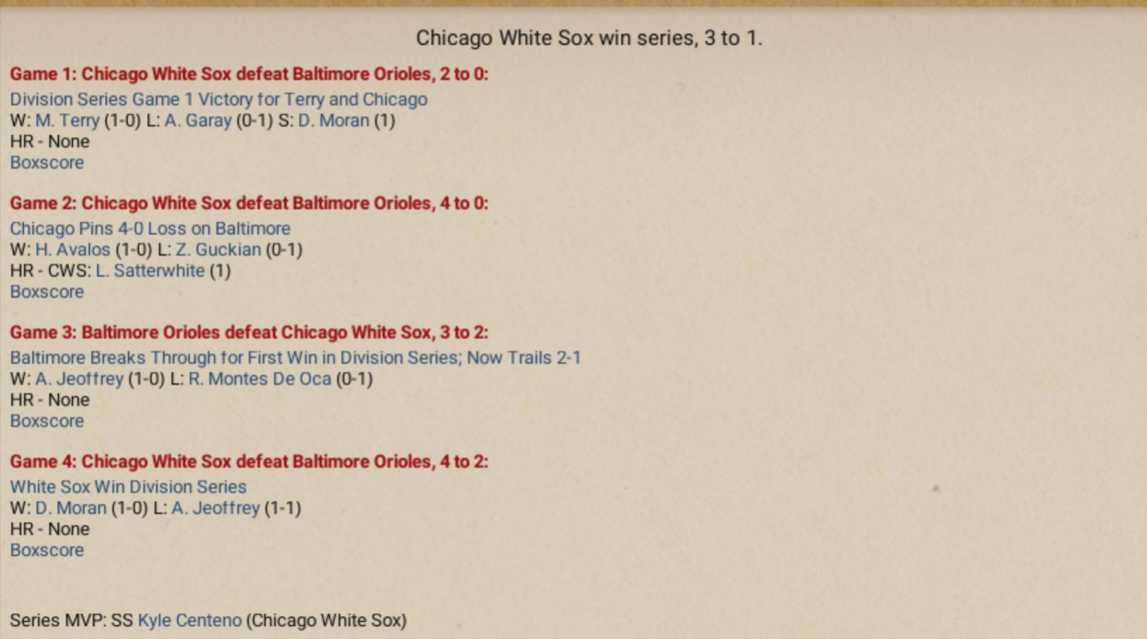 October 11, 1916 – Oriole Park at Camden Yards WHITE SOX 4, ORIOLES 2 — CHICAGO WINS SERIES 3-1 Yo, it’s your boy Willie Mays Hayes here, comin’ at you fast and flashy from Baltimore, where the Chicago White Sox just danced, dashed, and dove their way into their second straight ALCS — and did it with that cool, crisp style I like to call winning with flavor. Now lemme break this one down for you real smooth… Kyle Centeno, baby! This man was everywhere. MVP of the Division Series? You better believe it. Hit .400, crossed the plate three times, and looked smoother than silk on defense. You coulda served dinner off his glove. He’s the kinda player you don’t wanna face with the game on the line… unless you like watching fireworks you didn’t plan. The game? Tight. Like me trying to fit into last year’s cleats. White Sox got it started early with a run in the first, then went real quiet — like, library quiet — for seven innings. But the ninth? Ooh boy, Rehfeld stepped up with a double that cleared the bags like a fire drill. Boom. Just like that, Chicago flips the score from 1-1 to 4-1. Mic drop. Baltimore tried to get cute in the bottom of the ninth, made it 4-2, but that was it. Too little, too slow. And let’s not forget those Oriole errors — FOUR of ‘em! C’mon now! You can’t win a playoff game kickin’ the ball around like it owes you money. Pitching? Alex Cruz was stone cold. Seven innings, two hits, seven walks (heh — little wild there, kid), but ZERO bombs. Then D. Moran came in and sealed it like a pro. You love to see it. Defense? Three double plays by Chicago. That’s what I’m talkin’ about! Like I always say, you hit it on the ground, you’re gonna run like me or you’re gonna run back to the dugout. So now the Sox are sittin’ pretty, waitin’ to see if they face the Yankees or the Astros. Either way, you know they comin’ with speed, gloves, and just enough swagger to make your grandma lean in and say, “Now that’s baseball.” White Sox, baby — movin’ on, lookin’ good, and runnin’ like I taught ‘em. Stay flashy, Willie Mays Hayes “I hit like Mays, I run like Hayes, and I always deliver when it counts.” |