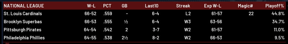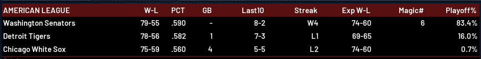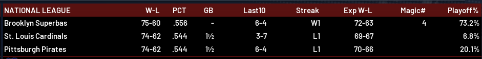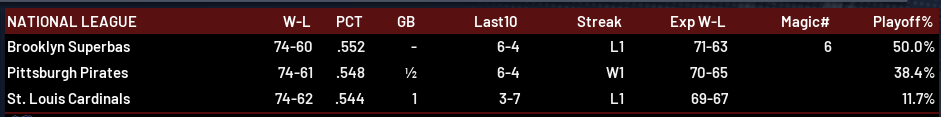 Wow. Both Leagues legitimately have 4 teams fighting it out. It looks like my Highlanders went on a good run winning 7 of their last 10. Unfortunately, it's too late. This is how baseball was meant to be. Down to the wire, ulcer-inducing, fingernail biting and sleeplessness until the final game of the season.
