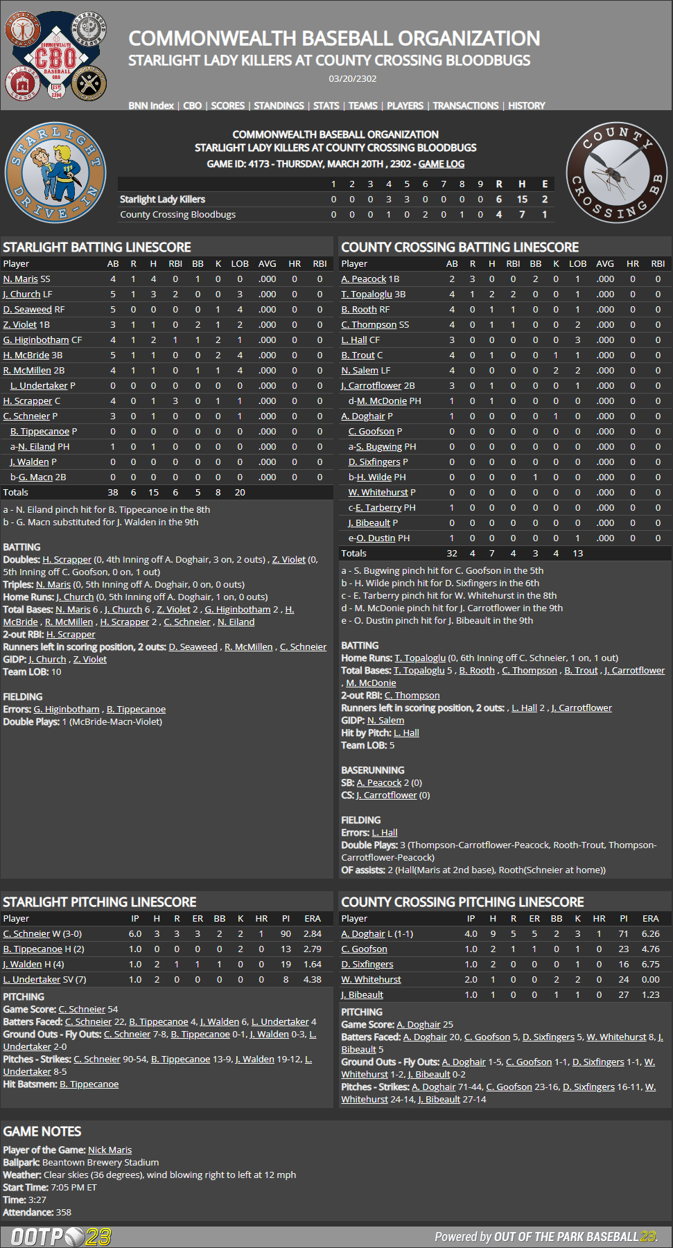 This Week in the CBO, BMU, GBRL, and BYDL by Nat Wright-Kawolski 17 March 2302 2302 CBO Nuka Cup Preseason Tournament Semifinals 15 March County Crossing 7 at Atom 5 The County Crossing Bloodbugs came out swinging, taking a 5-0 1st-inning lead on their way to a 7-5 victory over the Atom Cats in Game One of the 2302 Nuka Cup Semifinals. With the Cats' Copper Geffre on the mound, the Bugs wasted no time in taking the lead. Ajani Peacock led off with a single. With one out and Peacock on second after a steal, Babs Rooth went deep for a 2-0 lead. After Cy Thompson walked, Long Hall hit the second two-run homer of the inning, followed by Biter Trout's home run for the 5-0 advantage. Rooth was the game's MVP, going 2 for 4 with a double, a home run, a walk, two runs, and three RBI. Starlight 3 at University Point 2 The Starlight Lady Killers' Chris Schneier pitched 7.1 shutout innings, allowing just three hits with a walk and two strikeouts in earning the 3-2 victory over the University Point Deathclaws. Larry Undertaker pitched the 9th for the save despite giving up two runs in the inning. The Claws managed only six hits on the day, all singles, and totaled 10 men on base. The Killers' Nick Maris was 2 for 4 with a home run, two runs, and an RBI. 16 March Starlight 3 at University Point 8 The University Point Deathclaws did not wait until the 9th to score their first run, knocking in five in the bottom of the 2nd on their way to an 8-3 victory over the Starlight Lady Killers in Game Two of the Nuka Cup Semifinals. Wilson Beachball also pitched a good game for the Claws, allowing two runs, one earned, on four hits with three walks and six strikeouts in 6.1 innings. Two of Starlight's three runs were unearned. Beachball also contributed at the plate, hitting an RBI double and scoring a run. Jukebox Luttrell and Kory Richardson led the Claws in hitting with two hits apiece. Richardson had a solo home run, scored, and drove in three. County Crossing 3 at Atom 1 The County Crossing Bloodbugs clinched a berth in the 2302 Nuka Cup Tournament Finals with a 3-1 victory over the Atom Cats. Jared Zaccone pitched 6.1 innings, allowing one earned run on four hits with two walks and four strikeouts. Cy Thompson and Ajani Peacock both led the team with two hits and a home run. Only Zaccone's single was the other player to get a hit for the Bugs. Scruffy Taguchi had the loss, allowing two earned runs on two hits, both homers, in 5.0 innings. 17 March County Crossing 5 at Atom 10 The Atom Cats had too little too late in the series but picked up a nice 10-5 win over County Crossing on their way to the 2302 Nuka Cup Tournament Third Place Series. Jake Doucette went off on the Bloodbugs, going 3 for 5 with a triple, a home run, two runs, and four RBI. Four Cats in all had 2+ hits, including starting pitcher Deedee Martinson who was 2 for 3 with a run and an RBI. Earthbound Bussey was 3 for 4 with a double, a home run, a walk, a run, and an RBI. Bugs' hitters Babs Rooth, Ajani Peacock, and Cy Thompson all stayed hot. Rooth doubled and homered in the game. Thompson also homered. Pinch hitter OK Dustin, who replaced Rooth, also added two hits. Starlight 9 at University Point 1 The Starlight Lady Killers earned a trip to the Nuka Cup Finals with a big win over the University Point Deathclaws, 9-1. The Claws scored three in the 1st inning and never looked back. In the top of the 1st, Nick Maris led off with a single off the Claws' Phlip Wallace. Jesus Church walked and David Seaweed hit into a fielder's choice to put runners at first and third. Zeldolph Violet then went deep with a three-run bomb for the 3-0 advantage. Violet finished the game 3 for 5 with two doubles, a home run, three runs, and three RBI. Church added three hits, including a two-run home run. Starlight's Ray Human earned the victory, allowing just one earned run on seven hits with a walk and two strikeouts in 5.0 innings. His one run allowed came when his former teammate, Tomas Jones, hit a second-inning bomb. Both players got their starts in Nordhagen Beach in the 2296 season.