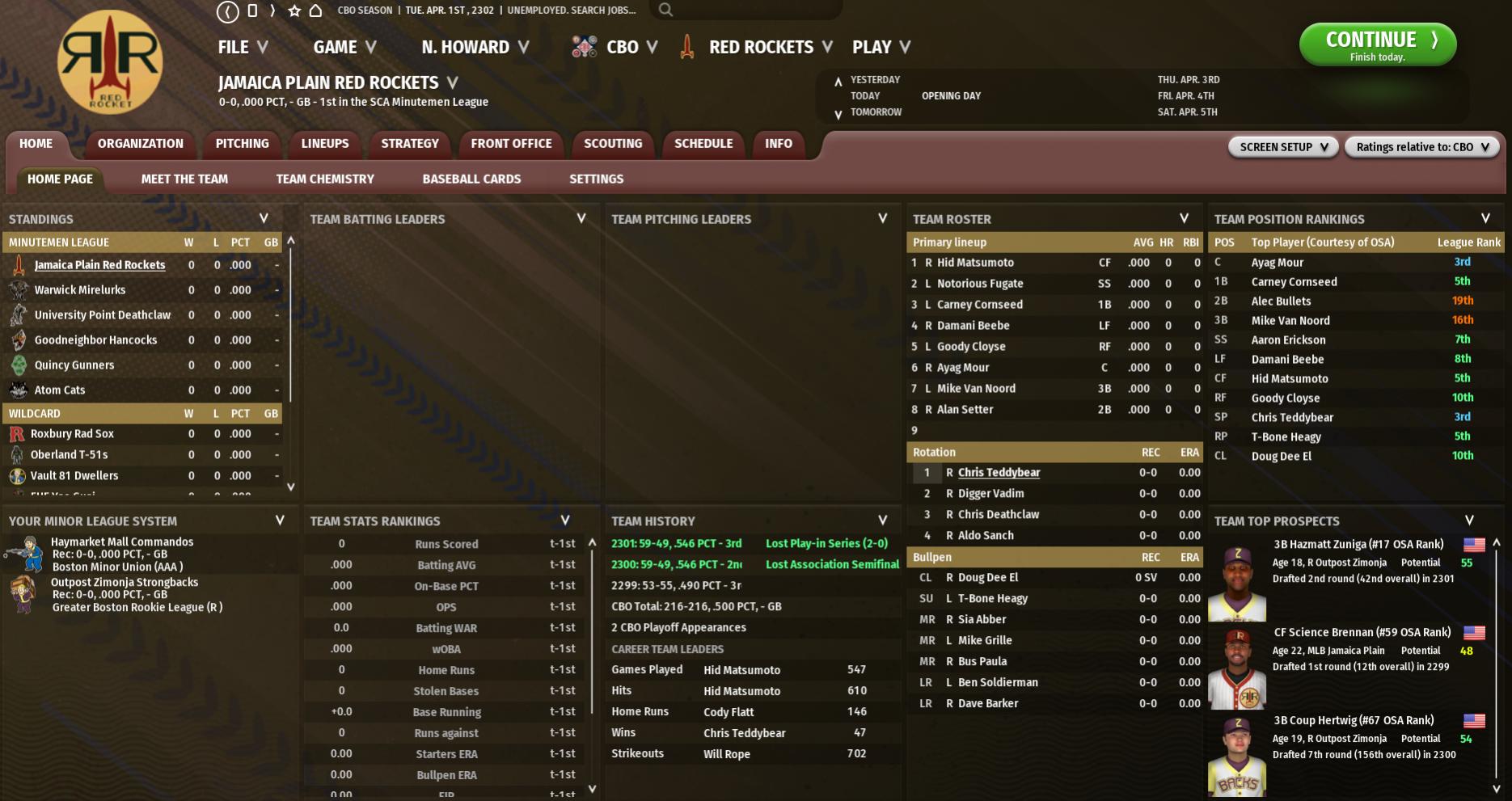 BNN Weekly Report This Week in the CBO by Nat Wright-Kawolski 1 April 2302 Top Players and Prospects CBO's Top Players and Position Strength by Team and by Positions CBO's Top Prospects Analyzing the Top 5 NOT on CBO Opening Day Rosters 1. 2B Diamond Ball, Clifton Vertibirds (GBRL, Warwick) - Drafted #1 overall in the 2301 Rookied Draft, Ball is expected to thrill the Mirelurks about what their future can look like. Expected to be a hitting force in the GBRL in 2302, Ball could find himself in the CBO on Opening Day 2303. 2. SS Cope Kearns, Lynn Fortune Finders (GBRL, Oberland) - The 2nd-overall pick in 2301, like Ball, Kearns is expected to be a beast on the field. While he is still working on making better contact, if he finds his stroke, he can hit for average and power, both of which the current T-51s squad could use. While they should not bring him up in 2302, the sky's the limit by 2303. 5. CF Stu Gains, Mass Pike Radroaches (GBRL, The Slog) - A 4th-round pick in the 2300 Rookie Draft, Gains has made huge gains in his talent. The Slog traded for him last July when the University Point Deathclaws were trying to secure their playoff squad. The Ghouls plan to start Gains at their GBRL facility, but we would not be surprised for him to spend most of his time with Everett of the BMU and maybe even be on the CBO squad at some point this season. 6. 3B Ross Merchantman, Sanctuary Hills Zetans (GBRL, Lexington) - The 5th-overall pick of the 2300 Rookie Draft, Merchantman did not have the best rookie season with the Zetans last season, batting only .157 in 76 games. However, he has a lot of talent and his power game can make opposing pitchers duck and cover. 7. SP Odd Thomas Koontz, Greentop Nursery Night People (BMU, Nordhagen Beach) - Drafted in the 2299 Rookie Draft in the 2nd round (36th overall), Koontz has used the last two seasons to work on an array of pitches. He split time with both of the Party Boys' minor league teams in 2301, but he did show marked improvement from 2300. If his 5-pitch load shows even more improvement, the Boys may need to find a spot for him in 2302 either as a starter or closer-in-training. The Complete List: