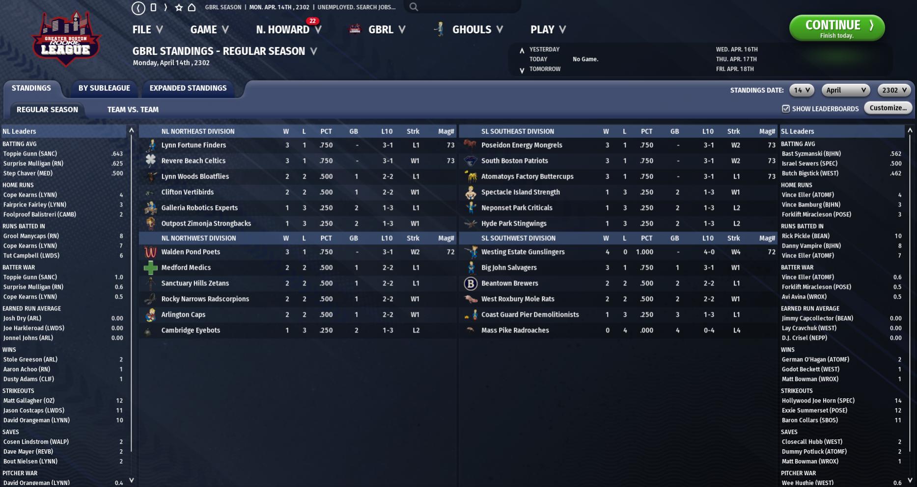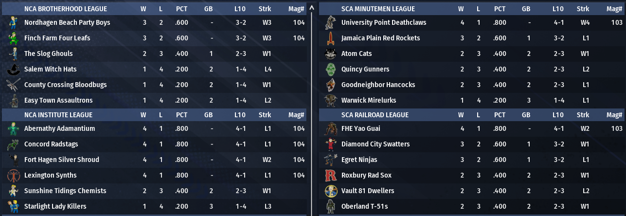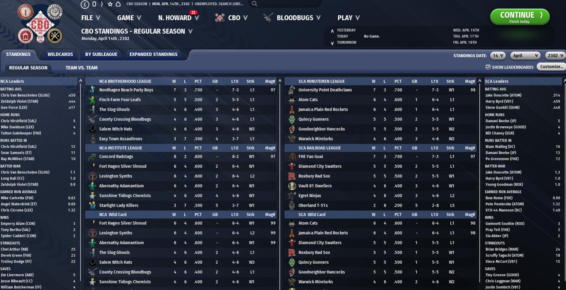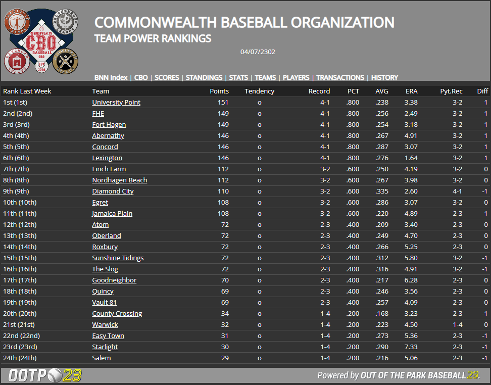 BNN Weekly Report This Week in the CBO, BMU, and GBRL by Nat Wright-Kawolski 14 April 2302 Week's Results Players of the Week NCA - LF Michael Fogcrawler, Nordhagen Beach, 7/19 (.368), 3 HR, 8 RBI, 4 R SCA - SS Jake Doucette, Atom, 10/17 (.588), 3 HR, 7 RBI Daily Top Players 4/7 - LF Michael Fogcrawler, Nordhagen Beach, 3/4, 2B, 2 HR, 5 RBI, 2 R 4/9 - LF Kory Richardson, University Point, 2/4, 2 HR, 5 RBI, 3 R, 2 BB 4/10 - LF Bill Chaney, Egret, 3/4, 2 HR, 3 RBI, 3 R 4/12 - SP Scruffy Taguchi, Atom, 7.2 IP, 4 H, 0 ER, BB, 8 K, W 4/13 - 3B Deerlord Fugivmee, Roxbury, 4/5, RBI, 4 R, BB Transactions Monday, April 14th , 2302 Vault 81 Dwellers: Placed SP Randy Kaplan on the 60-day injured list. Lexington Synths: Placed RP Bry McBourbon on the 7-day injured list, retroactive to 04/13/2302. Oberland T-51s: Placed SP Ben Rodgers on the 60-day injured list. Warwick Mirelurks: Activated SP Dobbie Radoncis from the restricted list. Warwick Mirelurks: Sent SP Dobbie Radoncis to Triple A Charles View for injury rehab. Oberland T-51s: Signed RP Cody Graca. Lexington Synths: Signed RP Right Overby. Vault 81 Dwellers: Signed RP Josh Maney. Vault 81 Dwellers: Released SP D'Andre Frost. Saturday, April 12th , 2302 Vault 81 Dwellers: Activated CF Aesed Hayjen from the injured list. Vault 81 Dwellers: Sent CF Aesed Hayjen to Triple A Vault 95 for injury rehab. Diamond City Swatters: Signed CF Brenden Titleman. Diamond City Swatters: Signed RP Jonathan Simoneaux. Friday, April 11th , 2302 Quincy Gunners: Placed SP Greg Hudgens on the 7-day injured list, retroactive to 04/10/2302. Lexington Synths: Activated SP Tristan Marble from the restricted list. Thursday, April 10th , 2302 Salem Witch Hats: Released CF Andy Dogleash. Quincy Gunners: Signed CF Andy Dogleash. Quincy Gunners: Released CF Earl Musicman. Wednesday, April 9th , 2302 Lexington Synths: Activated RP Evan Before from the injured list. Roxbury Rad Sox: Activated RP Odysseus Blades from the injured list. Roxbury Rad Sox: Activated SP Nuke Laloosh from the injured list. Fort Hagen Silver Shroud: Placed SP Mike Cartrette on the 60-day injured list. Fort Hagen Silver Shroud: Signed SS Jimmy Capcafe. Fort Hagen Silver Shroud: Signed RP Adam Froggatt. Tuesday, April 8th , 2302 Goodneighbor Hancocks: Placed 2B Jumper Hayes on the 7-day injured list, retroactive to 04/07/2302. Easy Town Assaultrons: Activated SS Matt Stoops from the restricted list. Fort Hagen Silver Shroud: Signed RP Ivan Indexer. Fort Hagen Silver Shroud: Signed RP Run Backes. Fort Hagen Silver Shroud: Signed RP Archer Robinson. Fort Hagen Silver Shroud: Released RP Run Backes. Fort Hagen Silver Shroud: Released RP Archer Robinson. Standings Team Power Rankings Weekly Team Power Rankings: Here are the current team power rankings for Commonwealth Baseball Organization: Analysis Two weeks in, and now we can see a little separation between the haves and the have nots. Concord (#1) appears to be the top among the haves, while Oberland (#24) are the nots. The Stags showed that have mentality by going 4-1 against the Brotherhood League for the second straight week. The T-51s followed up a 2-3 week with an 0-5 one against Minutemen League. There are some other trends, some surprises both good and bad, and some shake ups in lineups. Let's start with the Power Five. #1 Concord - As mentioned, the Stags come in as the number one team this week with the CBO's best record. Concord jumped up four spots from last week, showing consistency so far. The Stags started the week by defeating Finch Farm (#14) and then swept Easy Town (#23) and split with County Crossing (#19). Several Stags players are hitting lights out, led by LF Dan Erb (.324/3/8) and RF Gene Leftswipe (.378/0/3/2 SB). #2 University Point - The Deathclaws have yet to lose a series against the Railroad League, but they have split 3 of 5, leading to a 3-2 week this week to drop them out of the top spot. The Claws completed their sweep of Vault 81 (#18), which got good news that their star Aesed Hayjen is on his way back from injury soon. University Point then split series with Egret (#21) and Diamond City (#13). The Claws' pitching has been pretty bad, currently 11th in the SCA in Starters ERA (4.85). Star 1B Barker Cocoa has struggled to get on base outside of power hits (.233/3/8). If those two factors improve, the Deathclaws could run away with the SCA much like Nordhagen Beach did last season in the NCA. #3 - FHE - The Yao Guai did not do quite as well as last week, going 3-2, but they did only drop a spot as they maintain a tie for the SCA's best record. FHE started and ended the week with losses--Jamaica Plain (#8) and Quincy (#11)--but had three wins in a row midweek, including a sweep of Goodneighbor (#10) and a split with the Gunners. Pitching has been the key to the Radbears' success, especially ace Bow Rome (1-0, 0.90) who has allowed only two earned runs in 20.0 IP but has not had much run support from a team that is tied for 7th in the SCA in runs scored (42). #4 Nordhagen Beach - The Party Boys enter the Top 5 after starting 8th the first week, going 4-1 in Week 2. The Boys completed a weep of Lexington (#9), swept Fort Hagen (#6), and then split with Abernathy (#5), dropping the Sunday game to end their seven-game winning streak. Like last year, the Boys' success begins with their pitching, which is just as spectacular as ever with the least runs allowed (29), third-best Starters ERA (3.23), and top Bullpen (0.98) where they have only allowed three earned runs on the season so far. Ace Beachboy Nut (2-0, 2.81) had one "bad" game against Lexington where he gave up four earned runs in a win. He followed that up by holding the Adamantium to six hits and an earned run in 8.0 IP. #5 - Abernathy - After starting 4-0, the Adamantium have now lost 4 of 6, but BNN has them #5 in the Power Rankings because . . . ? We writers do not get to make all the decisions, but we can talk about what Abernathy is doing right, winning games they 