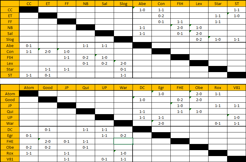 If time were not a factor, I might do daily score posts. Also, as a time-saver, I was debating whether to use charts, screen cap scores, or do something else like this: Games 1 and 2 County Crossing at Fort Hagen - 5-7, 1-2 Goodneighbor at Rox - 9-6, 4-6 The thing is, when I did post daily scores, I found I cared little for knowing the scores and paid more attention to looking at the standings changes each week. So, I will probably stick with the charts instead of individual scores.