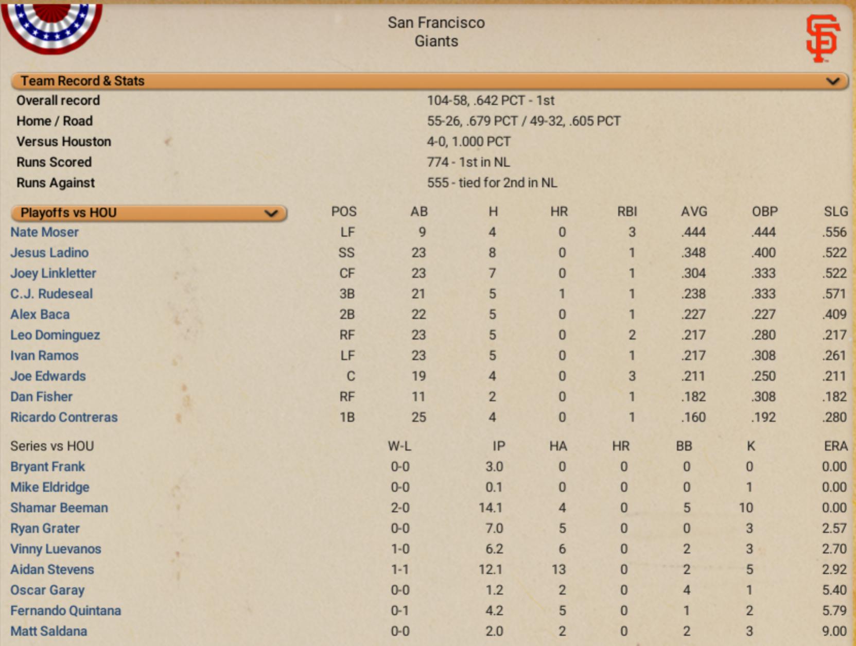 LOU BROWN RECAP — GIANTS WIN THE DAMN THING Well, I’ll be damned. San Francisco finally did it. The Giants shut the door on the Houston Astros, 1-0, in Game 6, and now they’re callin’ themselves World Champions. And hell, they earned it. Shamar Beeman? That kid pitched like he had a grudge against baseballs. Seven and a third innings, only gave up two hits and didn’t let a single run cross the plate. The guy was a bulldog out there. Gritty. Mean. Like the time I had to drag Cerrano outta the weight room for batting practice—Beeman wasn’t going anywhere. Quintana came in to close the damn thing out and didn’t blink. Not once. Kid got ice water in his veins. Now the offense… yeah, it wasn’t exactly Murderer’s Row, but they scratched one across, and that’s all you needed today. Baca had a nice double. Fisher knocked him in. Nothing fancy—just good, fundamental ball. Like I been screamin’ since spring training. And let me tell you somethin’, this wasn't some fluke. The Giants didn’t sneak into the playoffs through the back door. They won 104 games, finished first in the NL West, and outlasted everybody. They had heart, they had hustle, and most importantly, they didn’t screw around when it counted. The Houston boys? They fought hard. But three hits and two errors ain’t gonna cut it when the other guy’s throwing darts. That Goldsmith kid pitched fine, but if you don’t score, you don’t win. That’s just how it goes. So here we are. San Francisco’s on top of the baseball world, spraying champagne and actin’ like they just stole Christmas. And I say let ‘em. They earned every damn drop. Now, if you’ll excuse me, I’m gonna go ice my knees and have a whiskey. Congratulations, Giants. —Lou Brown (Manager, occasional philosopher) |