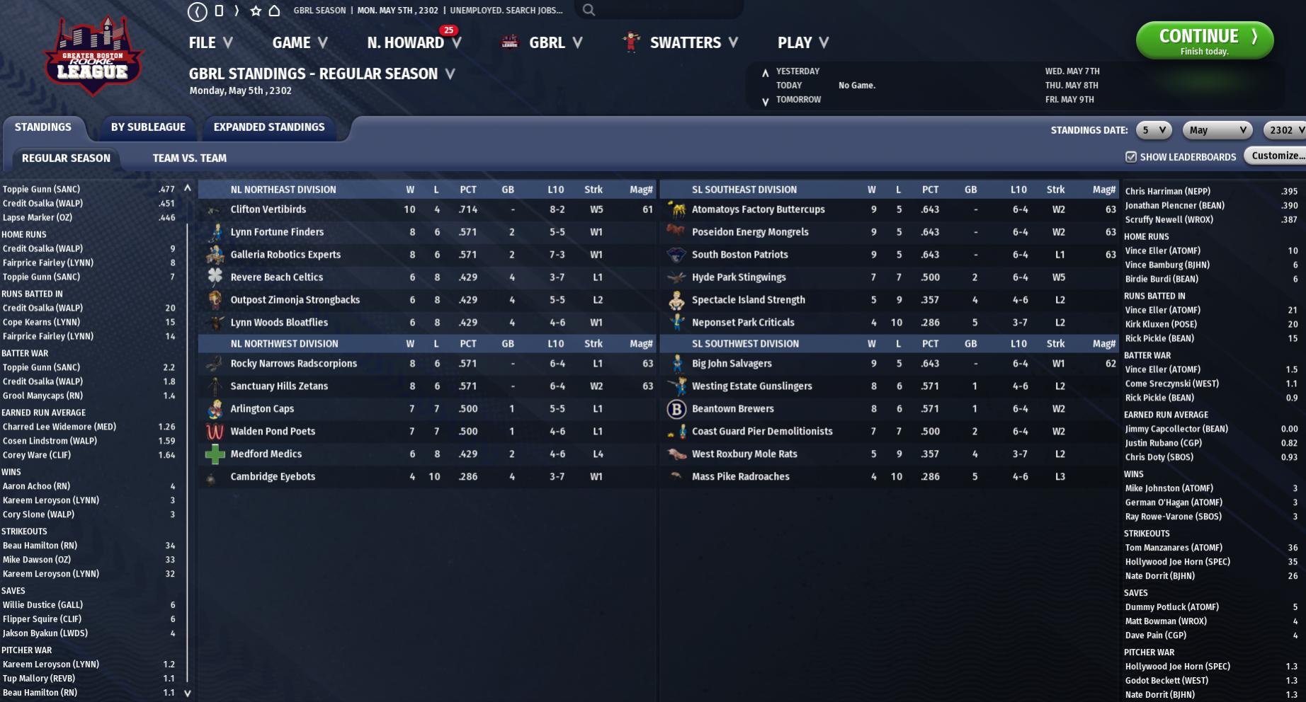 5 May 2302 ---------------------------------------------------------- Nuka News Update Reporting on the NWL, NWLB, and APYL Leagues by Evan Guy 5-1 Week Leaves Cave Crickets on Top The Victory Cave Crickets blew away its two opponents this week to move their record to 9-3 and two games up on Orange and Grape for first place. The Cave Crickets started the week with a three-game sweep of the Quartz Star Force before winning two of three versus the Cherry Ghoulrillas. The Tourists and Painted Ghouls are currently at 7-5. Orange helped its cause by winning two of three at the Ghouls but lost two of three at Quartz for a 3-3 week. Grape won its weekend series, two games to three, over the Dark Bloodworms. Dark's 1B Hunter Cobble was named this week's Player of the Week. In his five games, he only started two but got a hit in all three pinch hitter situations. On the week, he went 7 for 11 (.636) with 3 HR, 6 RBI, and 4 runs scored. The usual starter, 38-year-old Justin Salvage, who used to be a part of the Finch Farm organization in the CBO, is struggling this season, hitting at a .162/.220/.459 clip. He has three homers, eight RBI, and four runs in 11 games with nine starts. Besides Cobble's heavy-hitting week, three hitters have been off to a stellar start: LF Bruce Brownwater (Cherry), LF Tom Mastodon (Orange), and 3B Spratt Turnpike (Victory). Brownwater is second in the NWL only to Mastodon in average (.420). He also has four doubles, a triple, two home runs, 13 runs scored, eight RBI, was walked six times, struck out four, and has stolen five bases. The free agent pick up from the Vim! League's Echo Lake Harbormen has been a welcome addition. Mastodon is the leader in average (.423). He has also added a double, a triple, four homers, 10 runs, 10 RBI, walked twice, struck out once in 55 plate appearances, and stole seven bases. Mastodon was a 7th-round pick in the 2296 CBO Inaugural Draft but the County Crossing Bloodbugs. He was one of the Bloodbugs' top players the first four years, but got beat out in 2300 by current star Taygun Topaloglu. In 2301, he was traded to the Tourists for a couple of prospects but tore his ACL only seven games into the season. This season, he is looking to play a full season and blow away the NWL competition. Turnpike is improving on his 2300 and 2301 numbers. In 12 games, he is batting .404 with four doubles, five home runs, 13 runs, 16 RBI, four walks, three strikeouts, and a stolen base. He was originally a third-round pick by University Point in the 2297 CBO Rookie Draft but mostly sat the bench in his one year with their BMU team, the Boston Common Lead Bellies. He was then cut and signed with the Cave Crickets prior to the 2299 season. Standings APL and BBL In the Amusement Park League, the Nuka Bottling Plant Pack (Quantum) only had a 2-4 week but still hold onto the division lead by a game over the Nuka Town Operators (Orange). The Kiddie Kingdom Cappies (Grape) had a 4-2 week to move themselves out of absolute last and into a three-way tie for last place with the Bradberton Disciples (Victory) and Dry Rock Gulch Convicts (Dark). All three teams are at 5-7 and three games back of the Pack. 1B Blue Gralinski of the Safari Adventure Gazelles (Wild) was named the APL Player of the Week. He hit .769 on the week with 10 hits, two of those home runs. He also racked up six RBI and scored three times. The Bradberton Boys League started its 2302 campaign. The Fizztop Mountain Conquerors were the only team to start 4-0, while the Ol' Sugartop Buckaroos and the Mad Mulligan Travelers are both 0-4. Although the BBL did not name a Player of the Week for its first week, 1B Os Cazadore of the Conquerors blew the competition away to help his team to being first in every offensive category except stolen bases. In just four games, he went 10 for 19 (.474) with seven home runs, 10 runs, 11 RBI, three walks, and six strikeouts. Vim! View Veracious, Vivacious, Vainglorious Vision of the Vim! Leagues by Vikky Vail Standings Analysis Rayburn Point (15-9) is still atop the Fog Division while the Dalton Farm Fog Crawlers (16-8) stay atop yet again in the Harbor Division. The Patcheyes hold only a two-game lead over the Echo Lake Harbormen (13-11). Despite being atop its division, Rayburn Point is still middle of the pack both in offense and pitching. The Patcheyes went 5-1 on the week. The completed their series with the Cranberry Island Hermit Crabs by winning on Monday and Tuesday by one-run in each game. They then won the first three games at the Brooke's Head Behemoths before breaking their winning streak on Sunday in a 5-0 loss. The Fog Crawlers were only 3-3 on the week, but maintained their division dominance record-wise. Dalton Farm started the week by splitting two games with the Far Harbor Ghoul Whales (10-14). They then split a four-game series with the Grand Hotel Atoms (13-11). Currently, the Acadia Acadians (15-9) trail the Crawlers by a game. Player of the Week LF Edgar Virus, Echo Lake, 13/24 (.542), 3 HR, 7 RBI MDIL Report The Southwest Harbor Rippers (Echo Lake) of the Small Bertha Division and the Huntress Island Ug-Qualtoths (Dalton Farm) of the Old Longfellow Division are both at the top of their divisions at 16-10. 1B Colin Goldsworthy of the Ug-Qualtoths was named the Player of the Week. He was 16 of 28 (.571) with two homers, six RBI, and seven runs. He currently leads the MDIL in batting average (.447) and WAR (1.8). MYL Report In Week One of the season, the Far Harbor Dockdwellers (3-1) lead the Mount Desert Island Four. In the Great Diamond Island League, the Sunset Park Anglers are off to a 3-1 start for an early league lead.