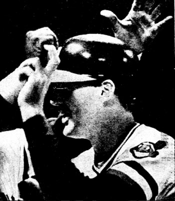 Can't claim that this is a good photo, but at least the Indians' logo can be seen in it. It's from the Cleveland Plain Dealer of September 28, 1984. The game when he hit his homer against the Twins must have been on September 27.