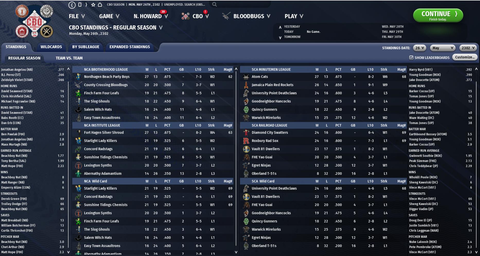 BNN Weekly Report This Week in the CBO, BMU, and GBRL by Nat Wright-Kawolski 26 May 2302 Week's Results Players of the Week NCA - RF Jonathan Angelou, Nordhagen Beach, 8/20 (.400), 3 HR, 11 RBI. Angelou has had an impressive last two weeks and currently stands as a leader for the NCA's Nuka-Hitter Award. Angelou currently leads the NCA in average (.377), OPS (1.187), doubles (16), total bases (107), extra-base hits (28), OPS+ (212), and wOBA (.497). SCA - 3B Ben Pettinato, Quincy, 10/22 (.455), 2 HR, 7 RBI Daily Top Players 5/20 - LF Jeremy Schoolboy, Atom, 1/1, HR (GS), 5 RBI, 2 R, BB 5/21 - CF Ben Pawlak, Fort Hagen, 3/5, 3B, 2 HR, 6 RBI, 4 R, BB 5/23 - LF J.D. Lumphead, Warwick, 5/6, 2B, RBI, R, BB 5/24 - C Bixton Moore, Fort Hagen, 2/5, 2 HR, 4 RBI, 2 R, BB 5/25 - RF Waze Waiting, Diamond City, 4/4, 2 HR, 4 RBI, 4 R, BB Transactions Monday, May 26th , 2302 Starlight Lady Killers: Placed SP Ray Human on the restricted list. Lexington Synths: Placed 3B Shane Stabb on the restricted list. Warwick Mirelurks: Activated 2B Bubb Islander from the injured list. Jamaica Plain Red Rockets: Signed 1B Clean Mullis. Sunday, May 25th , 2302 Oberland T-51s: Placed 3B Ryan Bale on the 7-day injured list, retroactive to 05/24/2302. Saturday, May 24th , 2302 University Point Deathclaws: Activated LF Mag Barbarian from the 60-day injured list. FHE Yao Guai: Placed 3B Pistol Schmidt on the 7-day injured list, retroactive to 05/23/2302. Lexington Synths: Placed RP Tom Chryslus on the 60-day injured list. Salem Witch Hats: Activated 2B Dan Ackerman from the injured list. Friday, May 23rd , 2302 Fort Hagen Silver Shroud: Signed RP Greg Bishopman. Fort Hagen Silver Shroud: Signed RP Jake Bunkerhill. Fort Hagen Silver Shroud: Signed RP Radical Tail. Fort Hagen Silver Shroud: Released RP Jake Bunkerhill. Thursday, May 22nd , 2302 Warwick Mirelurks: Activated RP Jayden Fleming from the injured list. Wednesday, May 21st , 2302 Atom Cats: Released RP Silton Bean.(Career-ending injury) Atom Cats: Signed RP Zachery Battle. Fort Hagen Silver Shroud: Signed RP Ben Fusioncore. Fort Hagen Silver Shroud: Signed RP Josh Hollander. Fort Hagen Silver Shroud: Signed RP Jake Bunkerhill. Fort Hagen Silver Shroud: Released RP Josh Hollander. Fort Hagen Silver Shroud: Released RP Jake Bunkerhill. Tuesday, May 20th , 2302 Abernathy Adamantium: Signed free agent RF Fernando Z to a minor league contract. Abernathy Adamantium: Released 2B Lester Atlas. Standings Team Power Rankings Weekly Team Power Rankings: Here are the current team power rankings for Commonwealth Baseball Organization: Analysis With 40 games down and 68 yet to go, the CBO's second month is approaching the end of its second month. In that time, a few teams have emerged through consistency, hot streaks, or a combination of the two. This week, a hot team has taken over the top spot. Let's take a look at the Top 5. #1 Jamaica Plain - They have won nine games in a row, but the Red Rockets still trail Atom (#2) by a game in the Minutemen League. Jamaica Plain zapped through their week with sweeps of Egret (#23) and University Point (#8). By being swept, the Deathclaws have now dropped five straight and now trail the Cats by three games. #2 Atom - They have not won nine straight but the Cats did have a perfect week to move atop the ML. Atom swept FHE (#13) for the second-straight week and Goodneighbor (#17). At 27-13, they are atop the SCA and tied with the 3rd and 4th teams in the CBO for the best record. #3 Fort Hagen - The Silver Shroud started the week with a loss but then won the last four for a good week. The Shroud split on their road trip to Finch Farm (#14) and then won all three at Abernathy (#22), the NCA's coldest team at 2-8 in their last 10. On the flip side, Fort Hagen is the NCA's hottest team at 8-2 in their last 10 and now lead the Institute League by six games over Starlight (#9), Concord (#10), and Sunshine Tidings (#11). #4 Nordhagen Beach - Like the Shroud, the Party Boys went 4-1 on the week except on a different path. Nordhagen Beach started the week by winning both games at Lexington (#15) and then winning the last two of three at Easy Town (#19). #5 Diamond City - The Swatters are tied with Roxbury (#6) for first place in the Railroad League. Diamond City won both games at University Point and then won the first and last games of a three-game series at FHE. Feature Story: Fort Hagen and Nordhagen Beach and All the Rest While the SCA has a number of teams that look to be legitimate contenders to win their association, the NCA is much different. In the NCA, both the Shroud and Boys are atop the association with a 27-13 record. The rest of the association features three teams at 21-19 and two more at 20-20. Everyone else is below .500. Fort Hagen has a legitimate shot to supplant the Party Boys as the NCA representative in the Sole Survivor Series. With the CBO's top batting average, the offense has been a beast in the IL. Four players are batting over .300 with CF Ben Pawlak (.358/11/35) in the Nuka-Hitter Award conversation. C Bixton Moore (.303/10/24) has been a pleasant surprise from the 8th position. He currently leads the CBO for catchers in home runs, SLG (.583), total bases (77), and ISO (.280). In all, he is in the top 5 of catchers in 17 of 24 offensive categories. Pitching has also been a successful endeavor if you count only their first three pitchers in the rotation. With that said, the loss of SP Mike Cartrette to a major injury may be the one factor that prevents the Shroud from being a true championship contender. As of now, Derek Green (4-1, 4.19), Brent Hooker (5-1, 2.44), and Matt Hope (6-1, 2.33) are getting the job done, but fourth starter All Day Acosta (1-4, 12.27) will need to be replaced via a trade. Nordhagen Beach is atop the NCA in both runs scored (220) and runs allowed (135). Despite not being as successful this season as they were last season when they operated as a machine, the Boys are still looking better offens