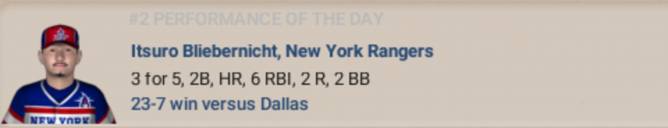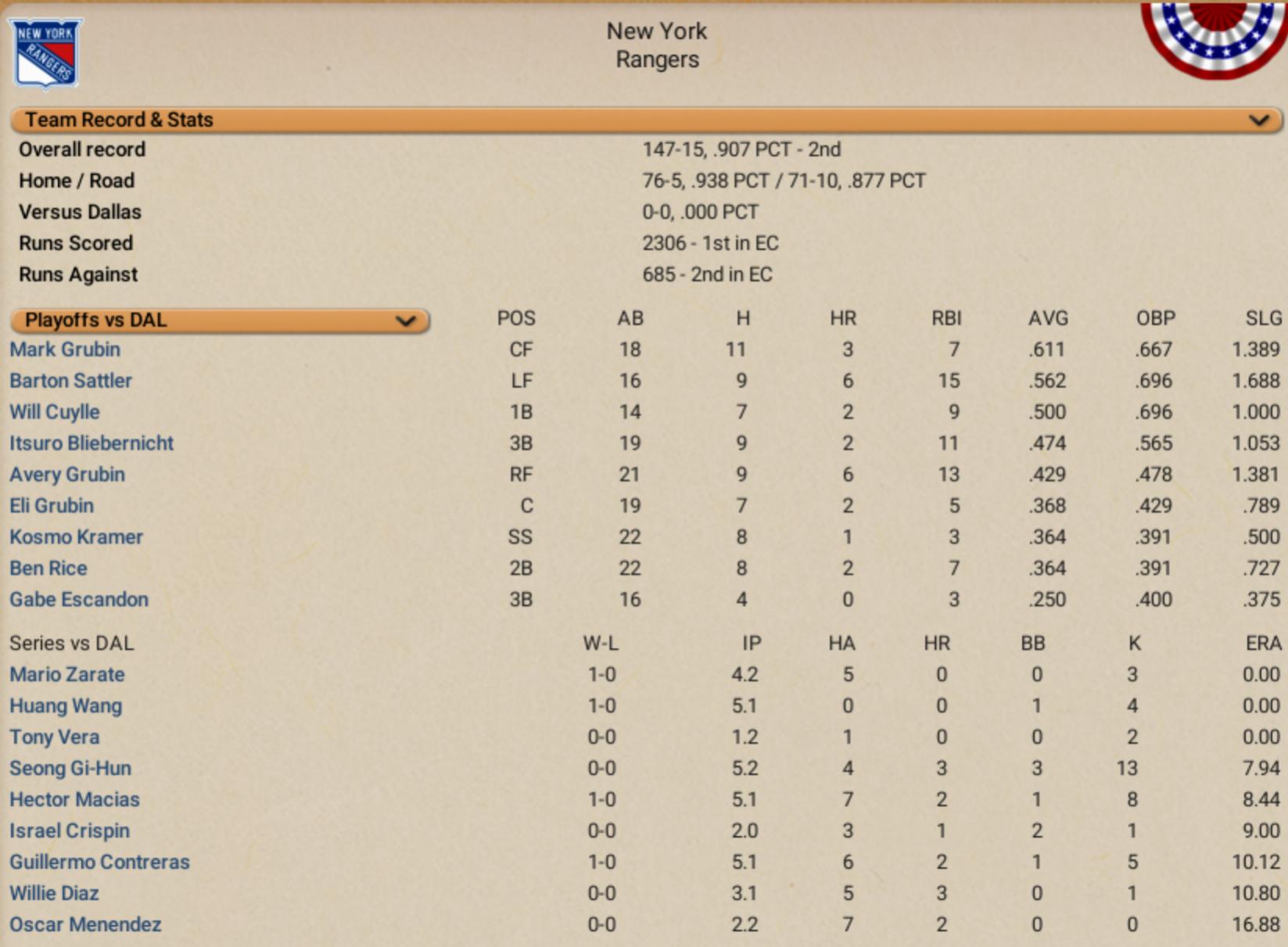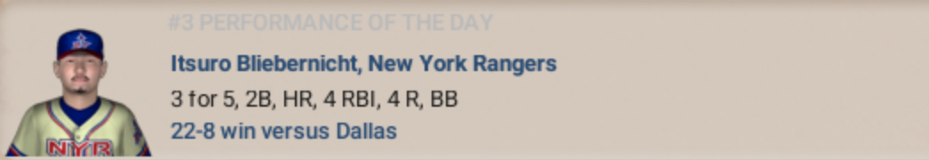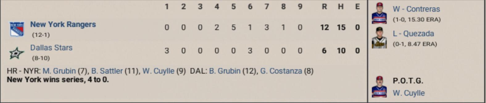 By Bill Parcells (if I coached hockey and wrote game recaps) October 19, 2002 – Stanley Cup Finals, Game 3 New York Rangers 23, Dallas Stars 7 Now listen, fellas—football, hockey, tiddlywinks, I don’t care what the sport is. When you get punched in the mouth three straight games, that’s not bad luck. That’s not injuries. That’s not "we just need to play our game." That’s who you are. And right now? The Dallas Stars are a beaten hockey team. You give up 23 runs on 23 hits in a Stanley Cup Final game? You didn’t come to play. That’s a lack of preparation, a lack of pride, and let’s be honest—some of those guys out there looked like they’d never even heard of defensive responsibility. Now let’s talk about the Rangers. You don’t score 61 runs in three games by accident. That’s execution. That’s focus. That’s everyone doing their job. I always told my guys: if you want to eat the cheese, you better be ready to set the trap. The Rangers? They set the trap, took the cheese, and made a damn charcuterie board out of the Stars tonight. You want a name? I’ll give you one: Avery Grubin. Three home runs. Seven RBIs. Scored four times. The man is out there playing like the game owes him money. You hang a pitch, he’ll put it in the parking lot. You pitch around him? He’ll wait, then make you pay next at-bat. That grand slam in the first? That’s a tone-setter. That’s the equivalent of telling your opponent, “We’re not just here to win. We’re here to embarrass you.” And let’s not forget the rest of them. Mark Grubin? Four hits, couple doubles, home run. Cuylle drew four walks—tied a playoff record. That’s discipline. That’s knowing the strike zone. Bliebernicht drove in six. Sattler? He didn’t even need to take his jersey off—he just keeps hitting and jogging. I’ve coached championship teams. And I can tell you this: when everyone on the team contributes, when every guy knows his role and executes it with precision—that’s how dynasties are built. The Rangers are up 3-0. They’re not hoping to win this series—they’ve already decided they’re going to. They’ve got the Stars reeling. The body language on that Dallas bench in the eighth and ninth? That's a team just trying to get out of the building without more damage. I used to say, “Don't tell me about the pain. Show me the baby.” Well tonight, the Rangers showed us the baby, the crib, and the nursery. They played like professionals. They played like champions. And if Dallas wants to salvage any dignity, Game 4 better be about more than just playing out the string. Because right now? The Rangers don’t just smell blood—they’re carving the Stars up and cooking dinner. Game 4 tomorrow night. We’ll find out if Dallas has any pulse left. If not? Start engraving the Cup. |